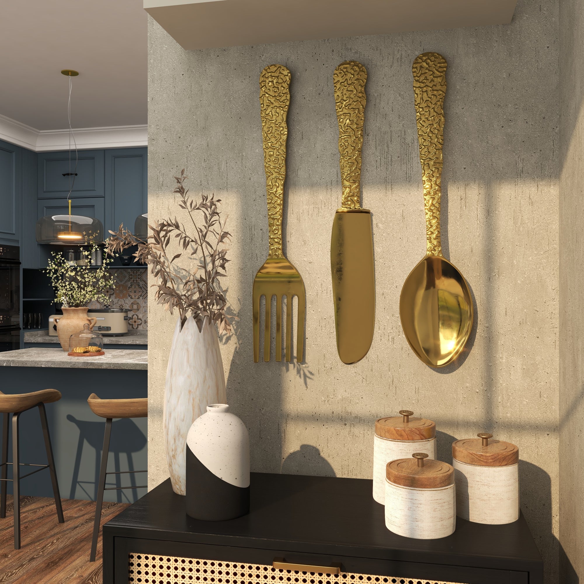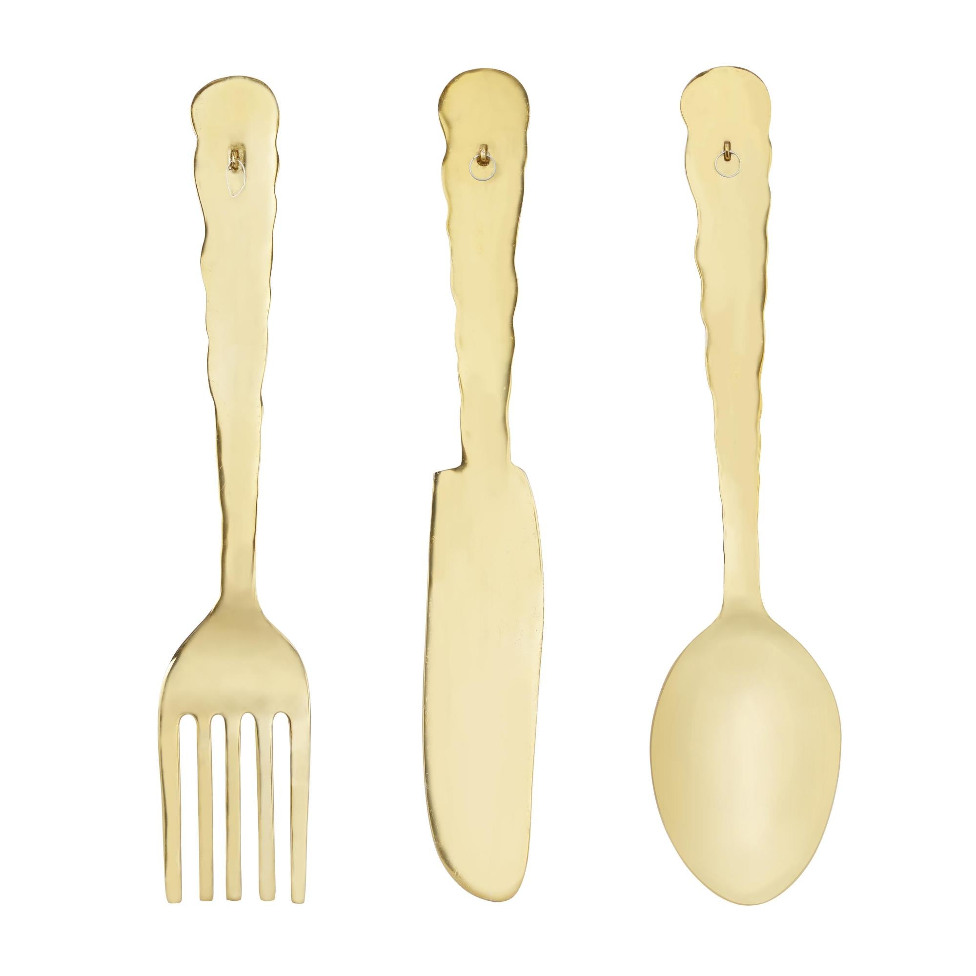 Set of 3 Utensils Gold Aluminum Metal Knife, Spoon and Fork Home Wall Decor