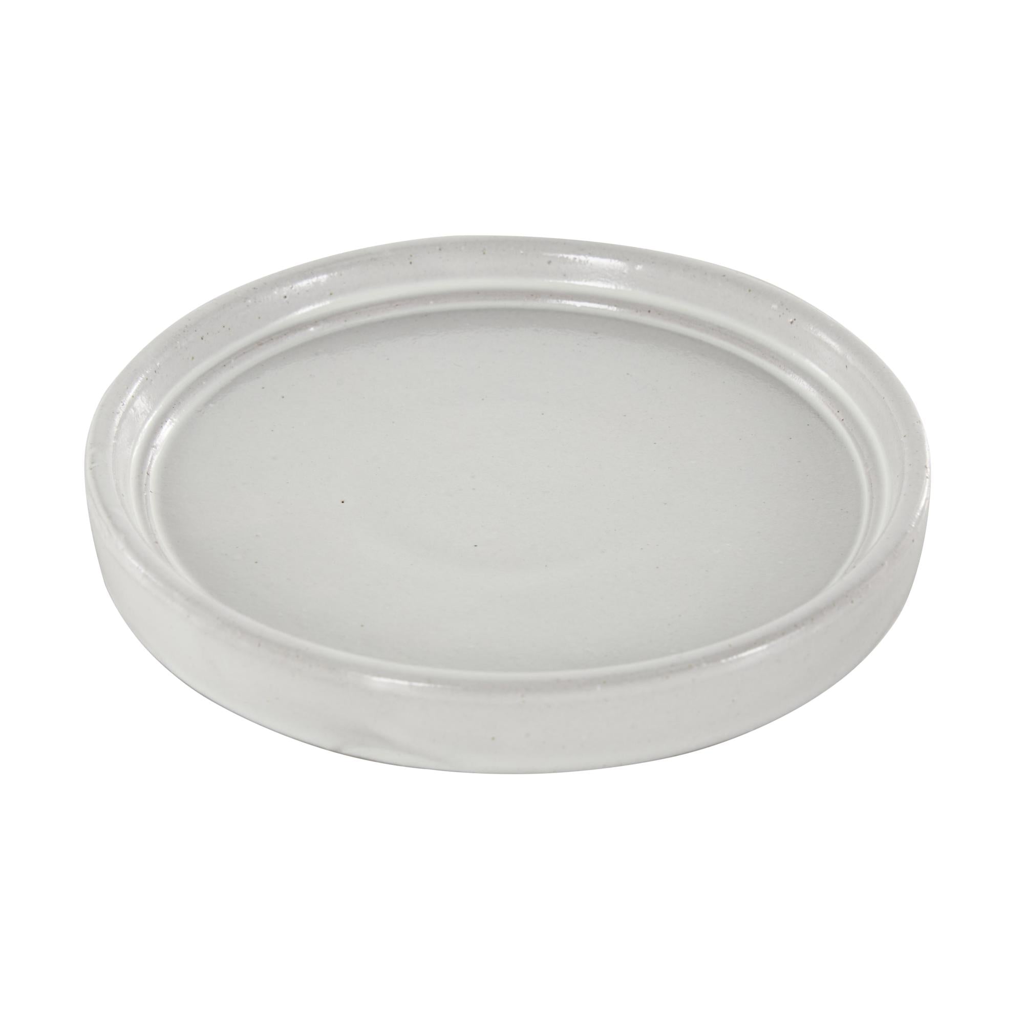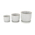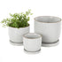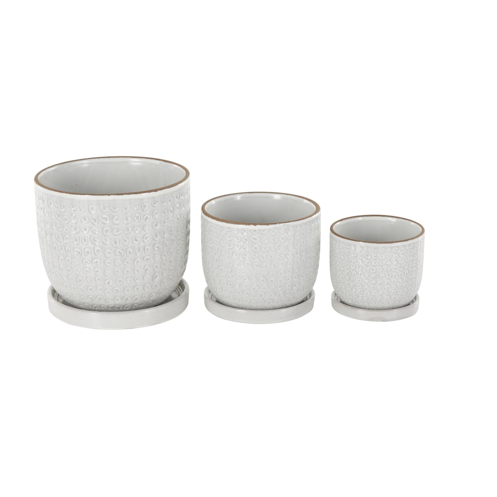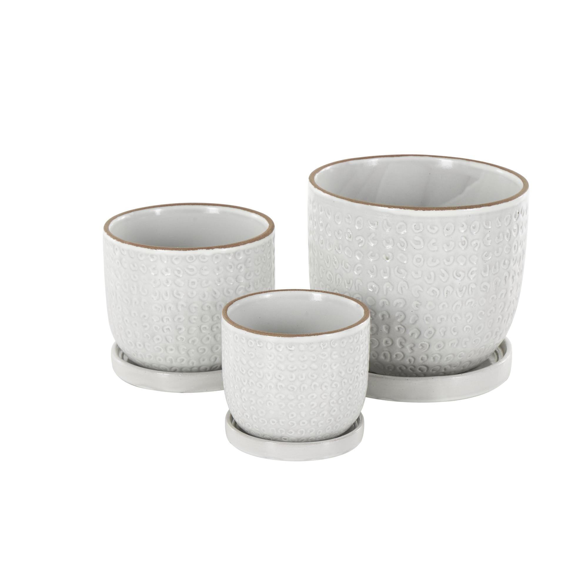 Set of 3 White Ceramic Abstract Circle Patterned Indoor Outdoor Planter with Brown Accents and Base Tray