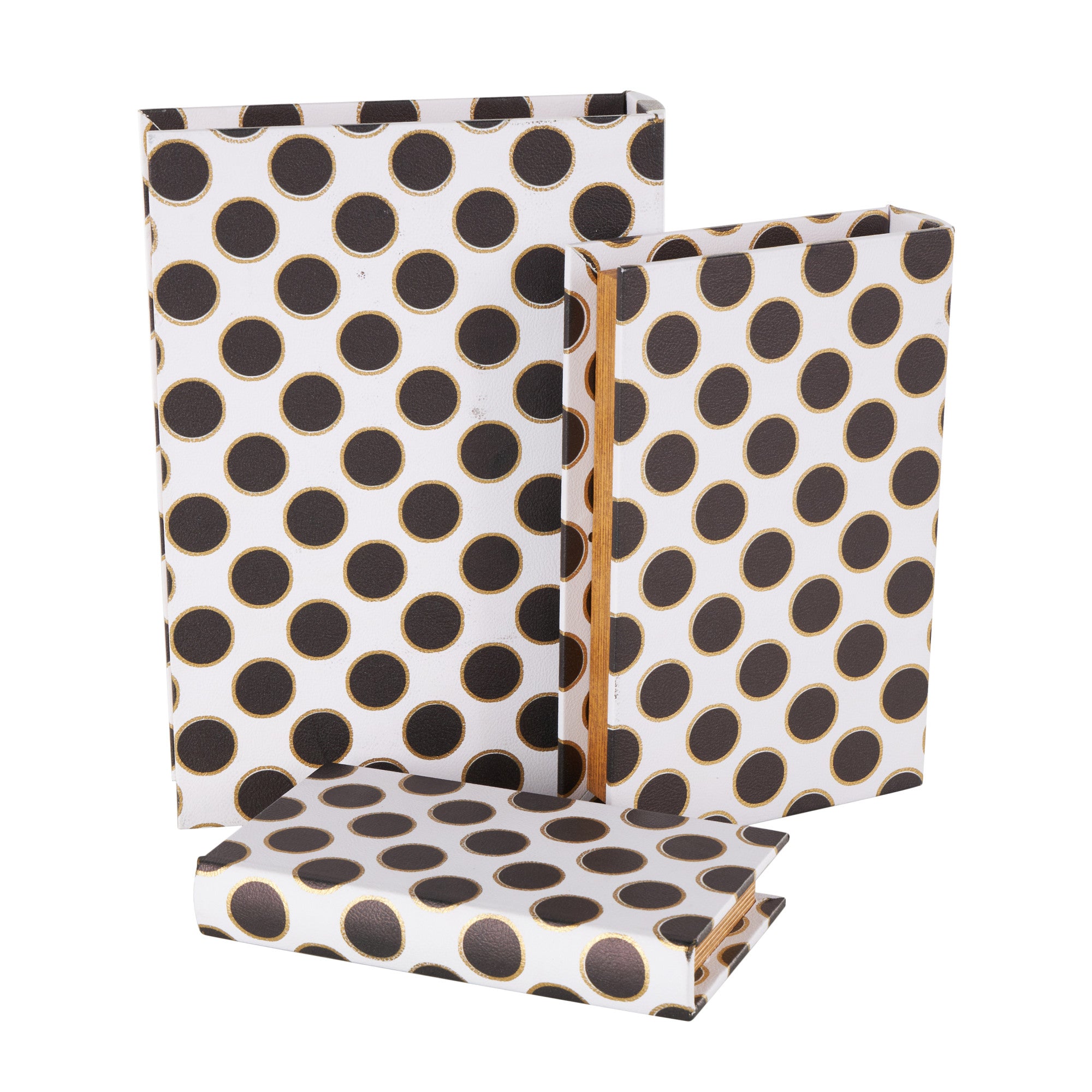 Set of 3 White Faux Leather Polka Dot Faux Book Storage Decorative Box with Black and Metallic Gold Accents