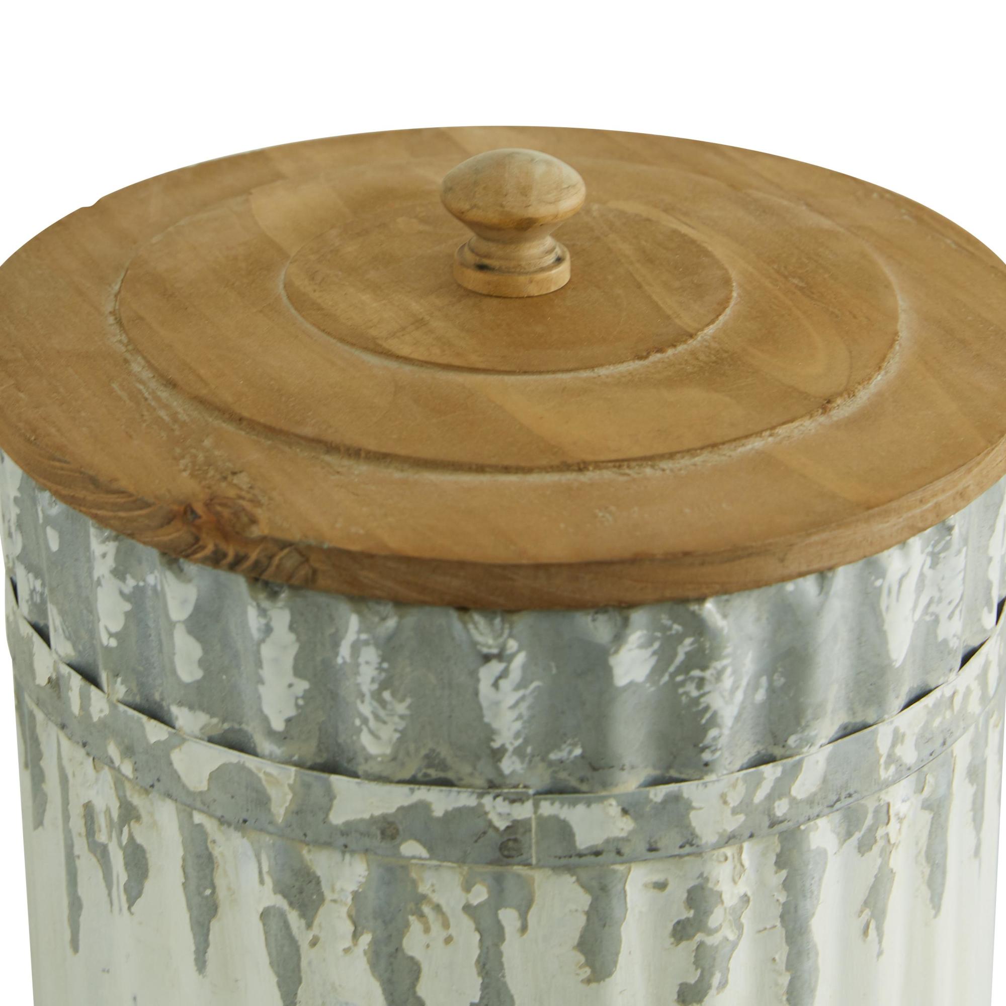 The perfect compact storage for your belongings while keeping your surface space protected. Give your surface space a finishing touch with these beautifully crafted decorative jars. This set of 3 decorative containers can be used to enhance the aesthetics of kitchen counters or other surfaces in your home. This item ships in 1 carton. Please note that this item is for decorative purposes only and is not food safe. Bodies are ribbed. Lids open by lifting from wooden handle.. Metal decorative jars make a great gift for any occasion. Suitable for indoor use only. This item ships fully assembled in one piece. This metal decorative containers comes as a set of 3. Farmhouse style. Vases have 7.30 in, 6.20 in, and 5.20 in mouth openings.