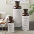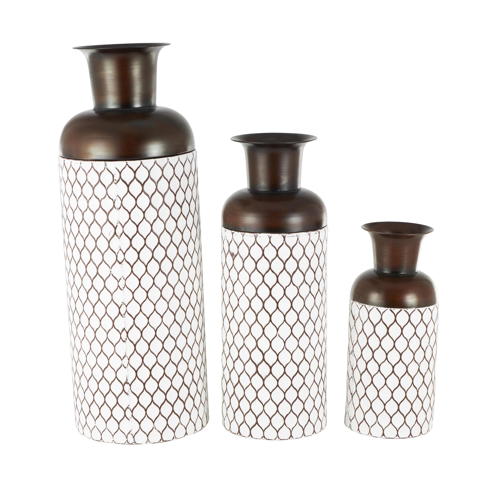 This set of 3 centerpiece vases can be used as standalone decorative pieces or to hold tall vase filler for an added aesthetic appeal in your living room or office. Designed with felt or rubber stoppers at the base that prevent scratching furniture and table tops, as well as sliding around. This item ships in 1 carton. Suitable for indoor use only. This item ships fully assembled in one piece. Made in India. This metal vase comes as a set of 3. Farmhouse style. Vases have 9 in, 8 in, and 6 in mouth openings.