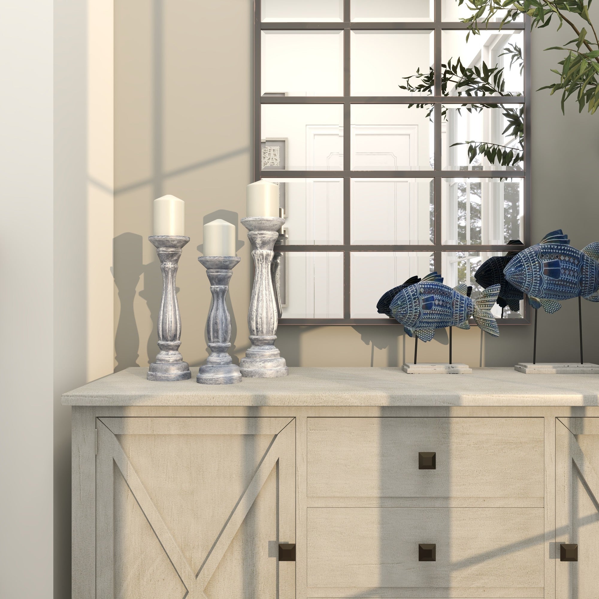 •Each piece in this traditional set of 3 candle holders for home decor is meticulously carved from wood and washed to achieve its unique design