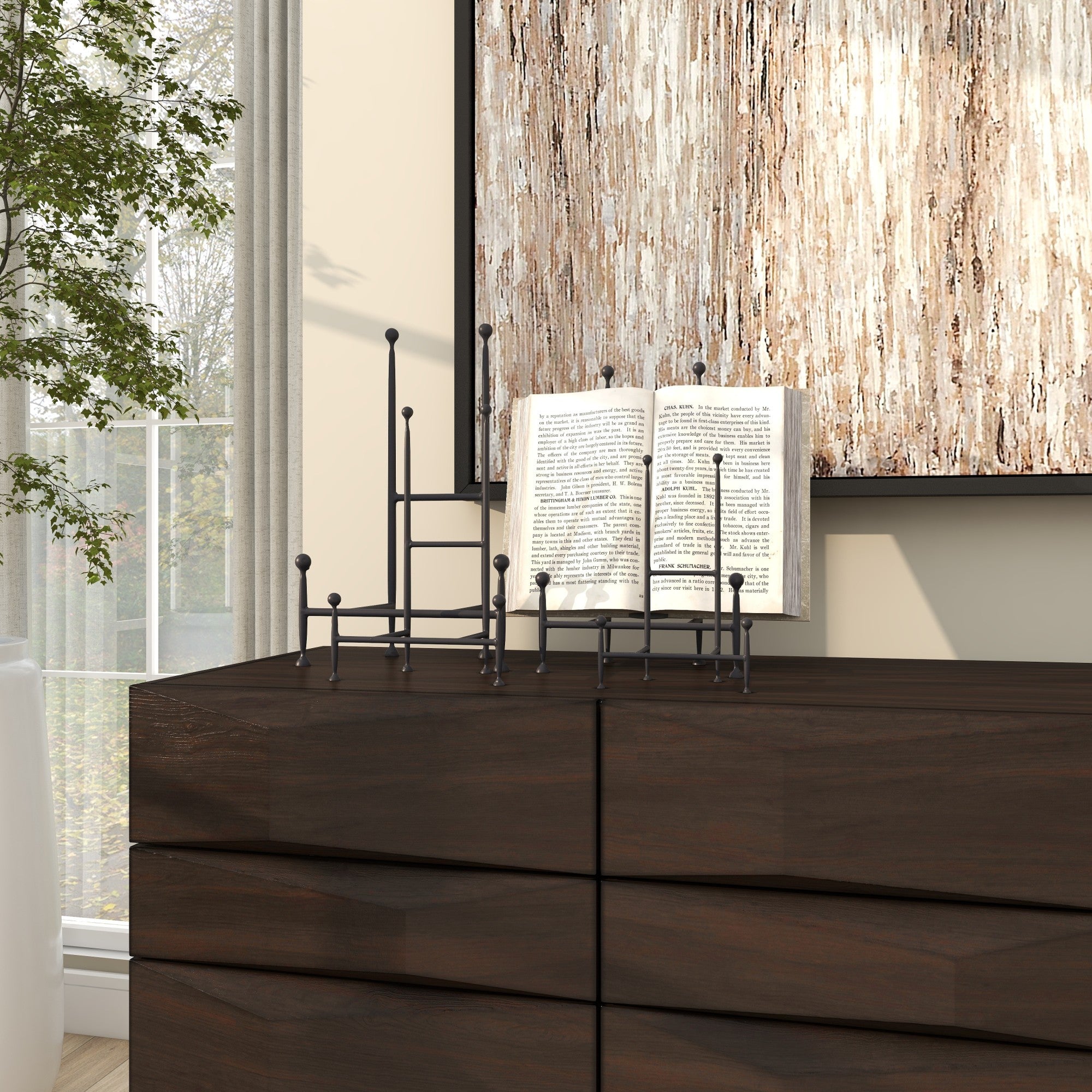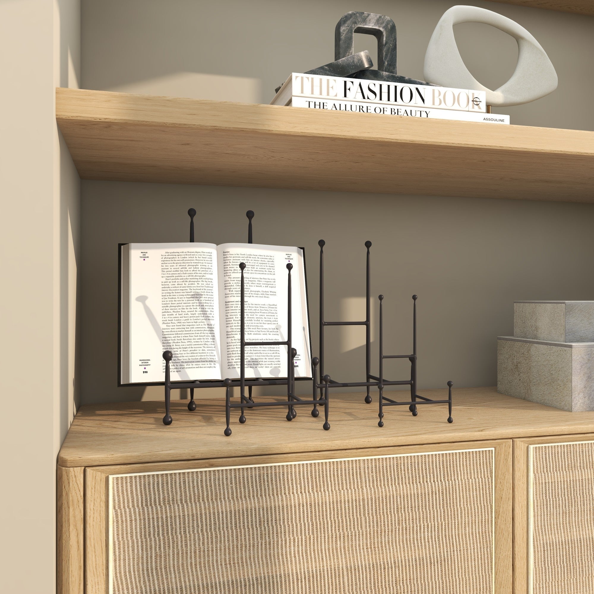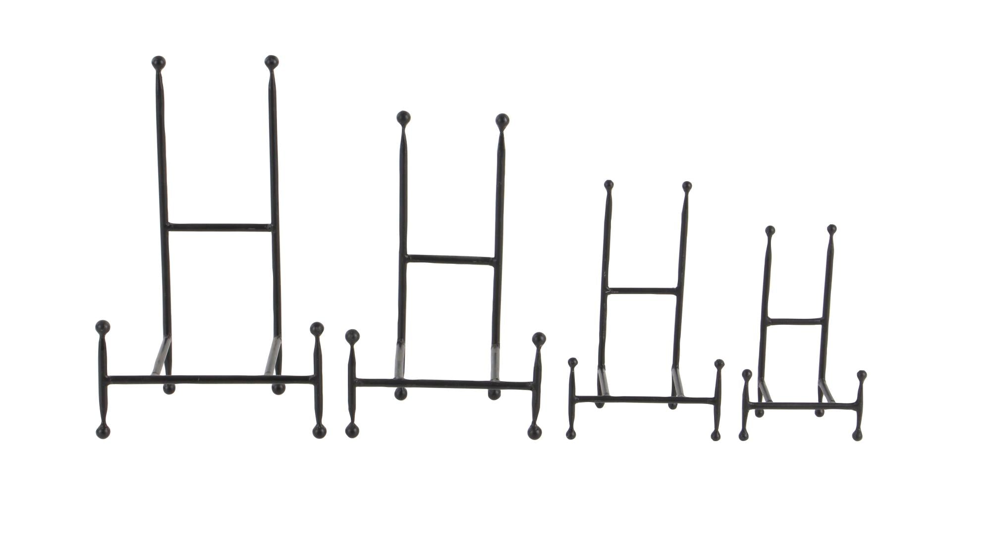 Put your show art and signs on display with this charming easel. Durable and sturdy, this easel lets you display your favorite things with ease, and with out overshadowing your piece. The set of 4 tabletop easel adds height to your desk, shelf, or mantel while elegantly displaying artworks or photos. This item ships in 1 carton. Put your show art, books, memorable moments and signs on display with this delicate easel. Suitable for indoor use only. This item ships fully assembled in one piece. Maximum weight limit is 5 lbs. Made in India. This iron tabletop easel comes as a set of 4. Modern style.