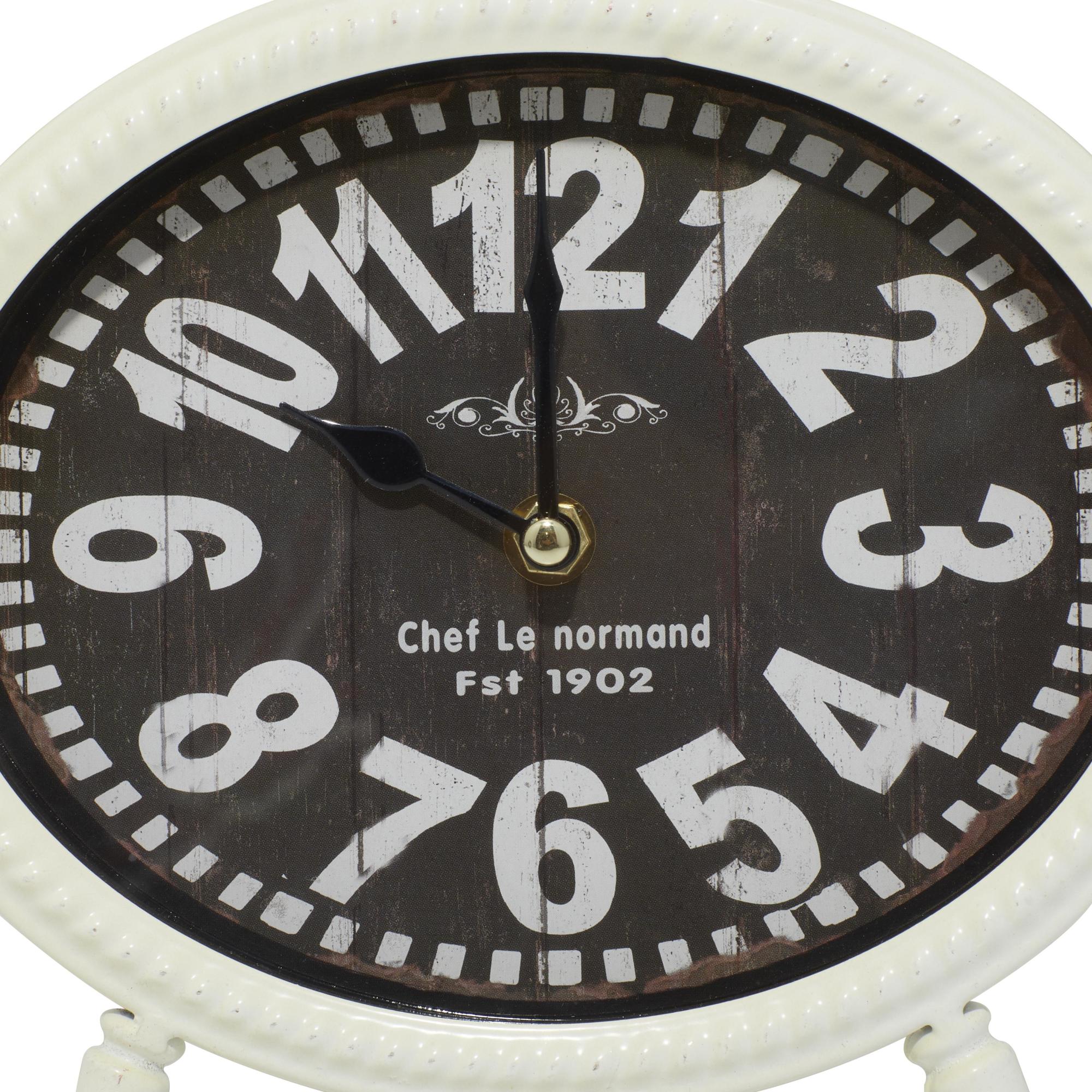 Improve your time management skills and keep a clock close by with this charming piece. A dashing display on any surface to help you manage your time throughout the day. Enhance your living room tables or consoles with this set of 4 mantel clock to instill a classic and elegant vibe. Requires 1 AA battery, not included.. This item ships in 1 carton. Features Arabic numerals, hash bars, and dot prints for minute and hour markers. The clock mechanism runs silent. Designed with beaded border frames. Iron clock makes a great gift for any occasion. Suitable for indoor use only. This item ships fully assembled in one piece. This iron mantel clock comes as a set of 4. Vintage style. Showcases typographies that read "Cafe de la Tour" "Depuis 1927", "Paris France", "Chef Le normand", "Fst 1902", "Choco Praline", "Chocolatier Confiseur", "Paris 1889", "an crown, London", and "1889".