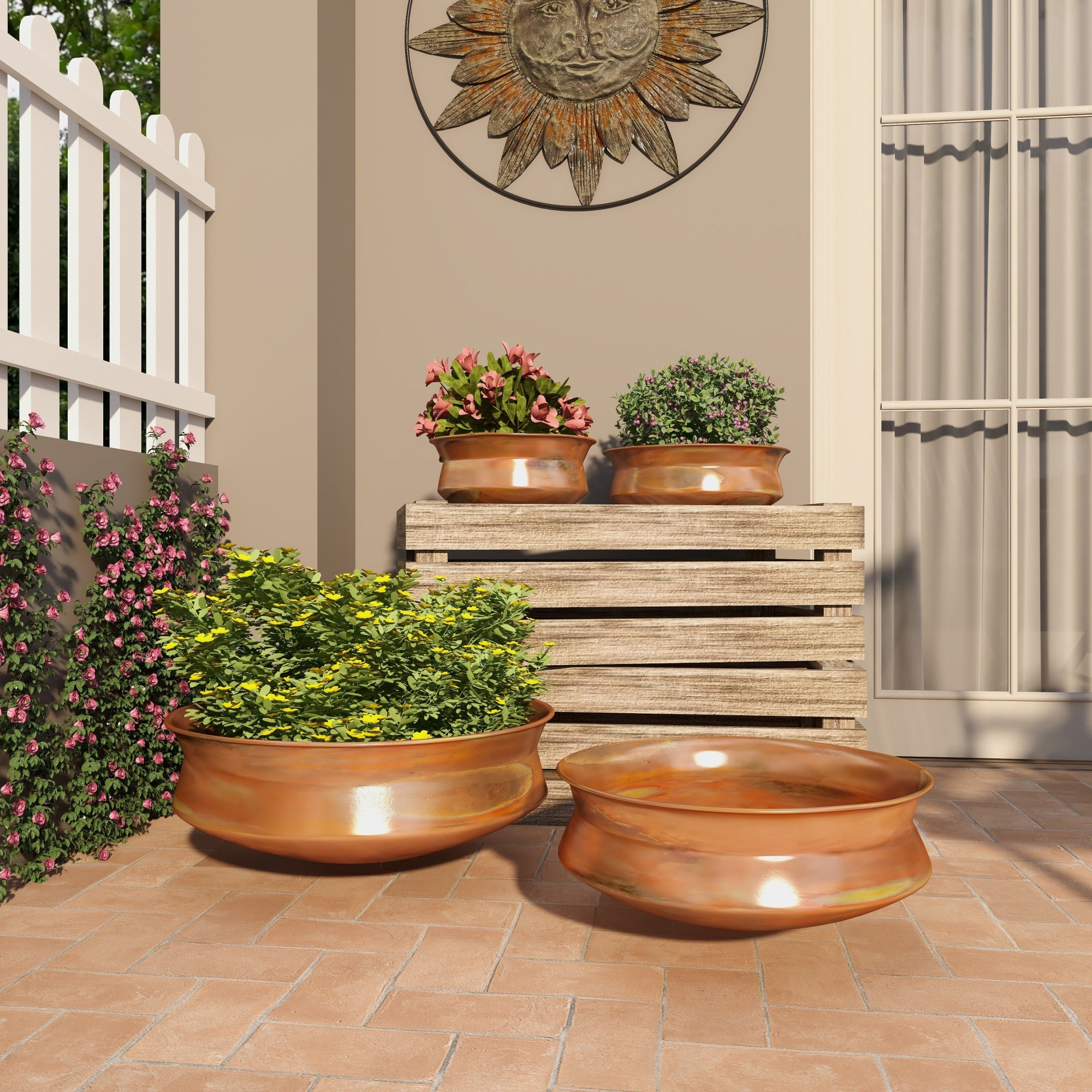 This wide set of 3 large planter pots can be used for housing various types of plants, both indoors and outdoors, adding an element of nature to your space. This item ships in 1 carton. Please note that this item is for decorative purposes only and is not food safe. Suitable for indoor and outdoor use. This item ships fully assembled in one piece. Maximum weight limit is 20 lbs. Made in India. Planters do not have drainage holes but they are not watertight. This copper iron plant pot comes as a set of 4. Rustic style.