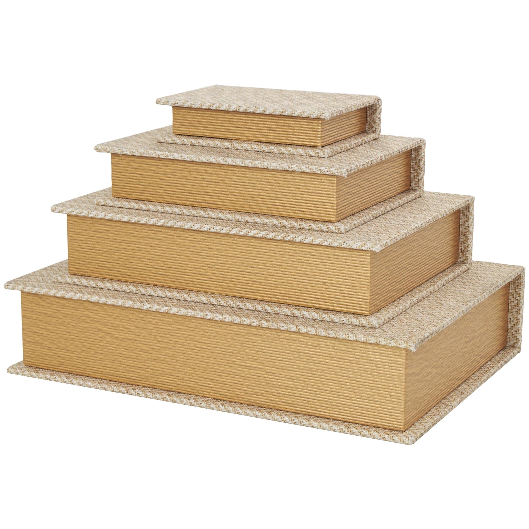 This set of 3 book-shaped boxes can add a touch of vintage charm to your glass or wooden bookcases with their uncanny resemblance to hardbound books. This item ships in 1 carton. Suitable for indoor use only. This item ships fully assembled in one piece. This linen book shaped box comes as a set of 4. Traditional style.
