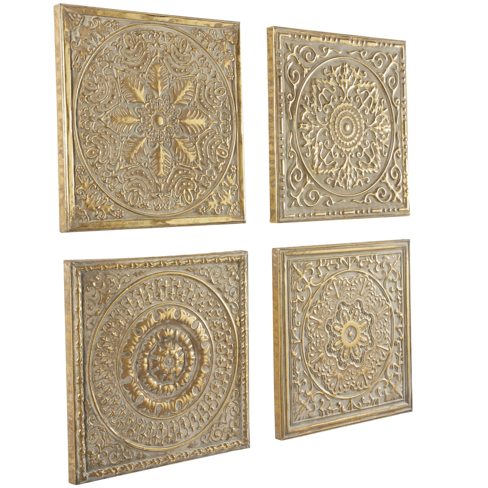 •This ion set of 4 wall decors features beautifully molded and gilded dimensional plaques with intricate designs of leaf stars, radial patterns, acanthus, and mandalas