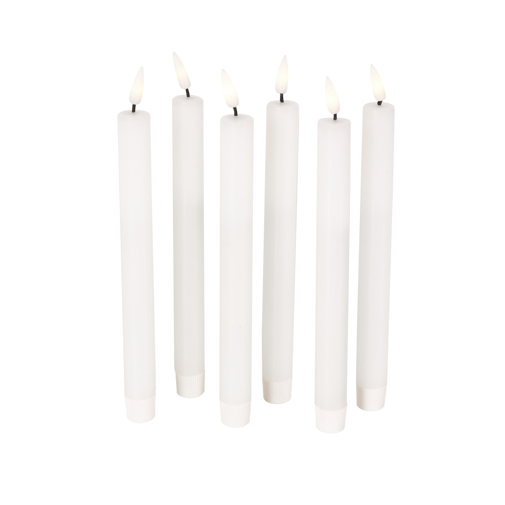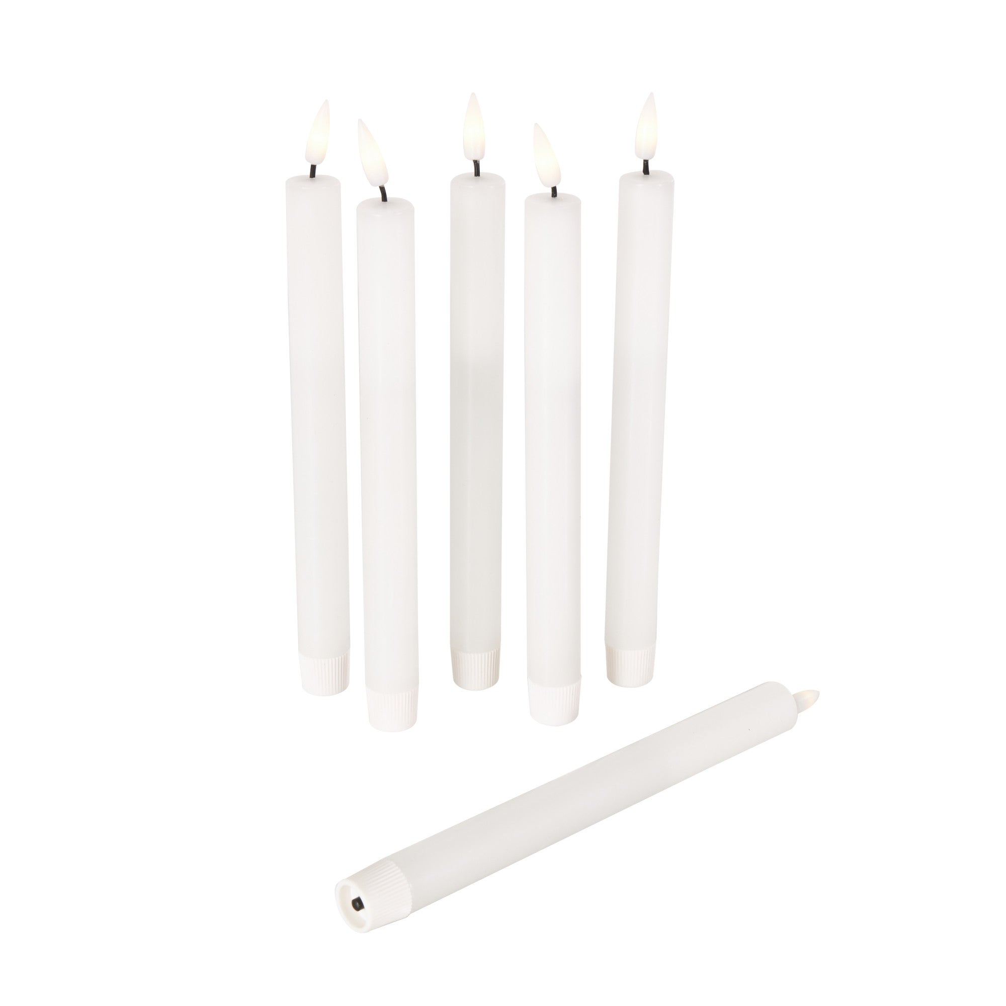 Perfect for living rooms or bedrooms, the set of 6 realistic LED candles adds a warm ambiance without the risk of fire. Designed with felt or rubber stoppers at the base that prevent scratching furniture and table tops, as well as sliding around. Requires 12 AAA batteries, not included. Includes 1 CR2025 battery.. These decorative candles are flameless with life like moving wick. This item ships in 1 carton. This set of LED flameless candle features life like moving wick. Wax flameless candle makes a great gift for any occasion. Suitable for indoor use only. This item ships fully assembled in one piece. This wax realistic led candles comes as a set of 6. Modern style.