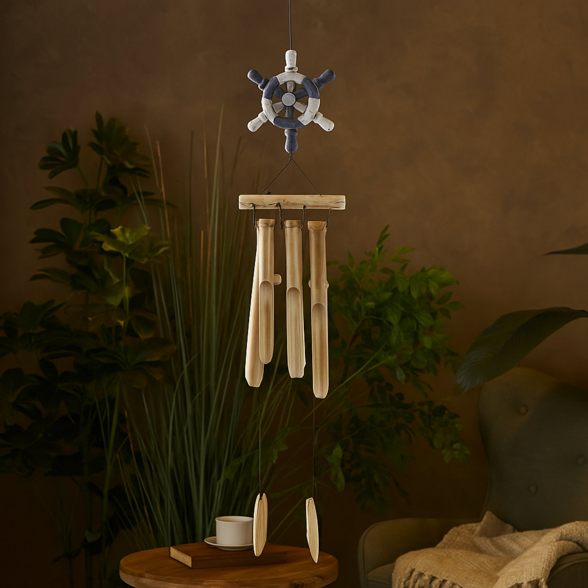 •This bamboo windchime showcases an intricate ship wheel design with log chimes that create soothing sounds when moved by the breeze