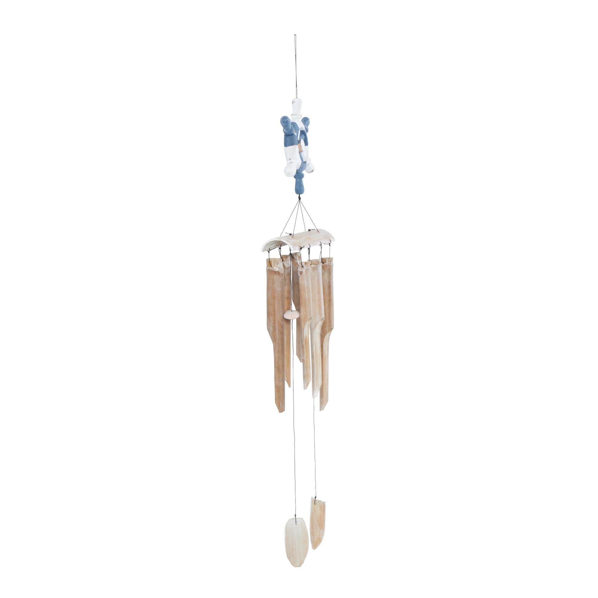 •This nautical wall art windchime is carved from wood and bamboo to form the ship wheel and log chimes, with the anchor painted in and colors for a coastal appeal