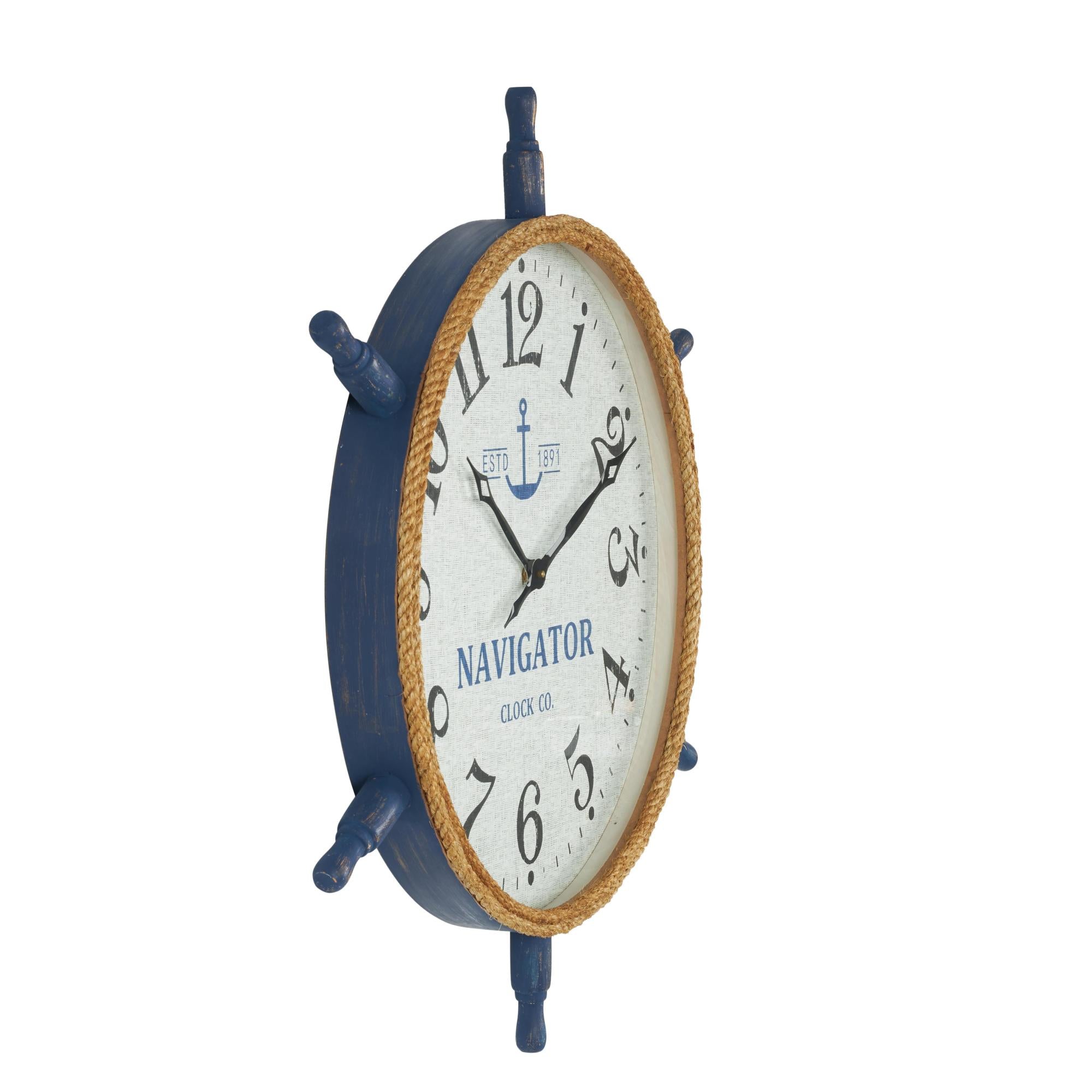 •Crafted from a combination of MDF, poplar wood, reed, pine, polyester, and glass material, this decorative wall clock showcases a unique nautical aesthetic