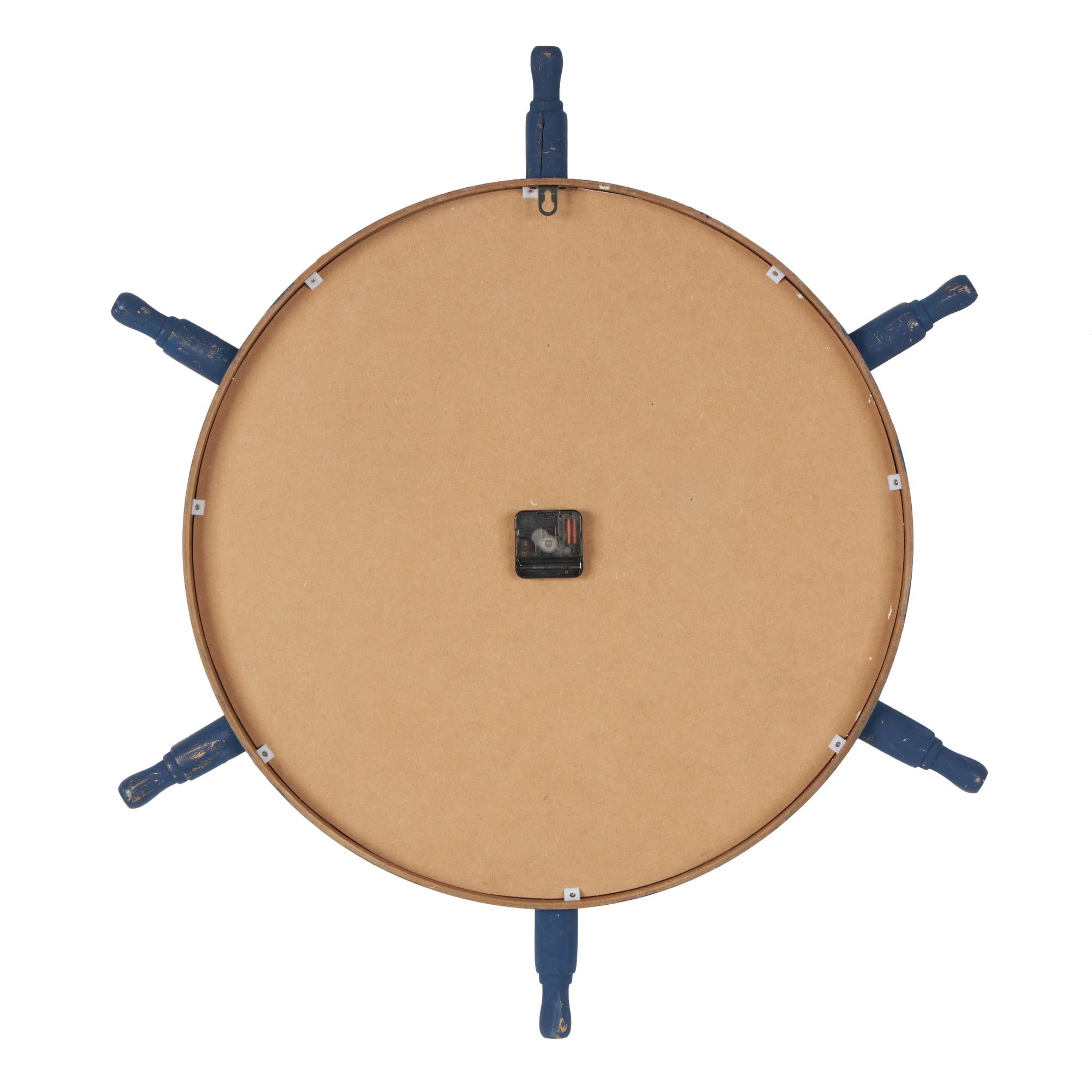 •Matte oversized wall clock resembles an authentic ship's wheel with its round form, spokes, and diamond shaped clock hands