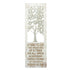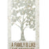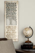 •Iron wall decor features an intricately designed tree as the focal point, accompanied by an inspirational family quote and a unique postmark-printed panel