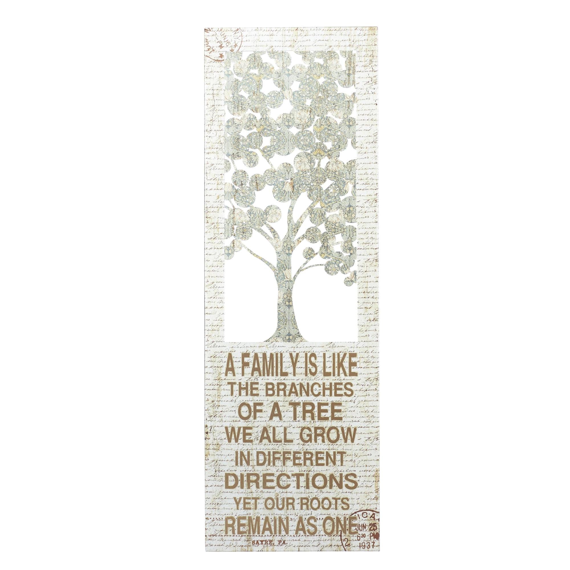 Perfect for vintage farmhouse-themed homes, this sign wall sculpture can enhance the aesthetic appeal of empty vertical spaces along staircases, hallways, or in the living room. This item ships in 1 carton. Features a beige-colored metal frame with typography and postmark in maroon finish. Iron wall decor makes a great gift for any occasion. Can be hung vertically using the metal rings; nails and screws not included. Suitable for indoor use only. This item ships fully assembled in one piece. This is a single wall sculptures. Farmhouse style. Typography includes "A family is like the branches of a tree. We all grow in different directions yet your roots remain as one".