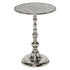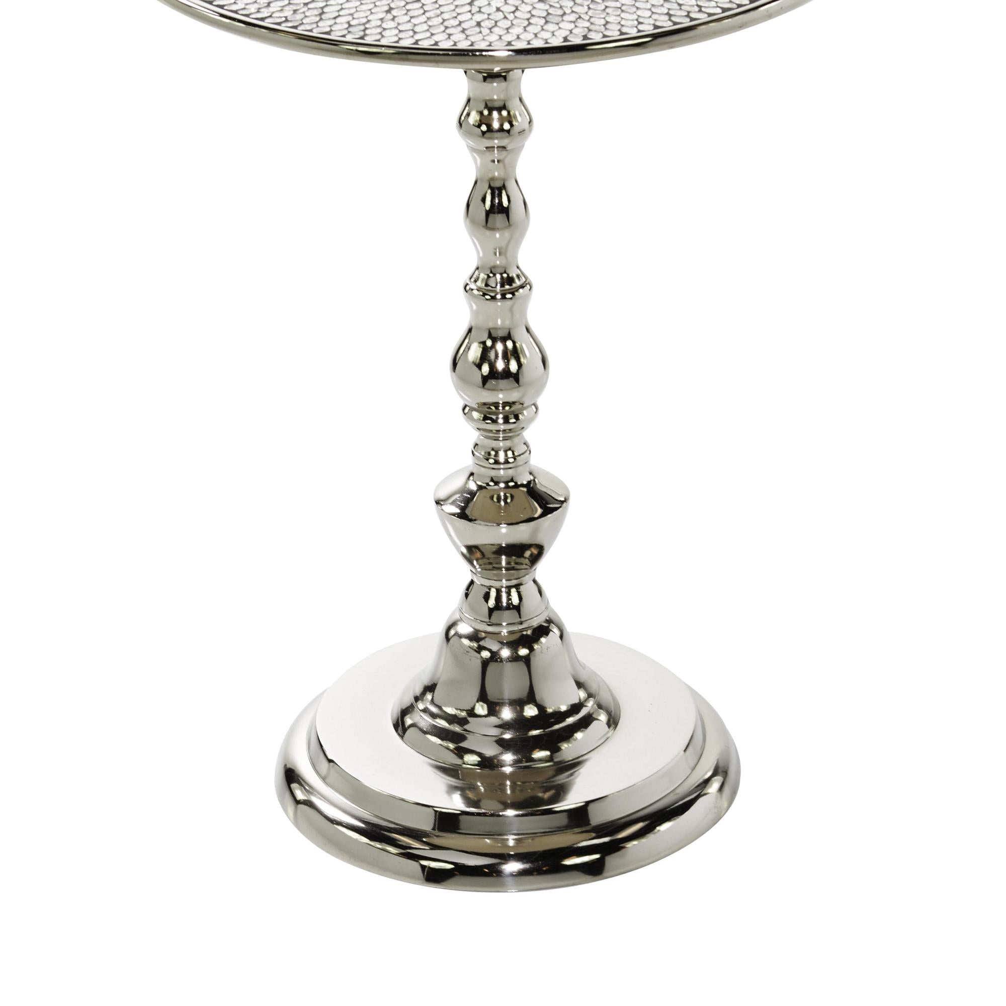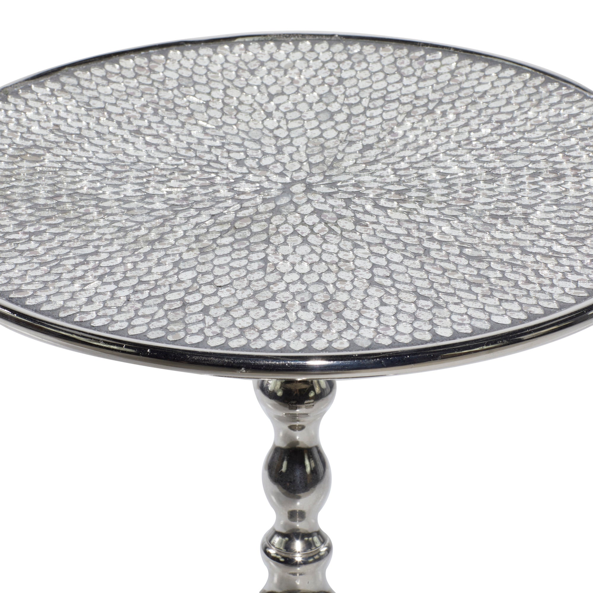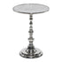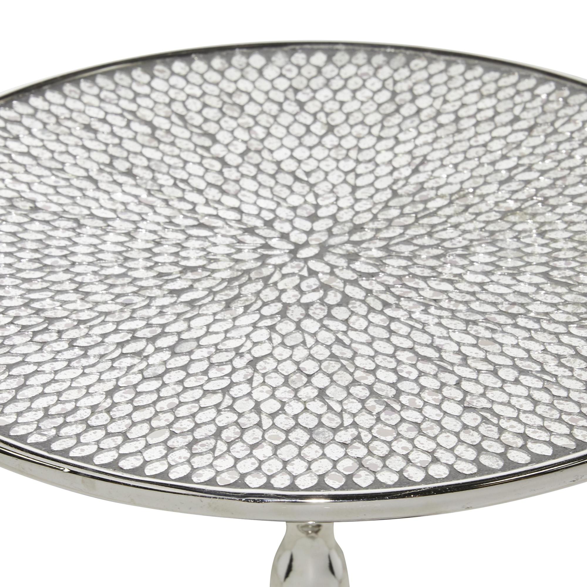 •This aluminum accent table stands out with its traditional pedestal design featuring an antique mirror-inspired top in a mosaic pattern, placed on a turned style stand with a round tiered base