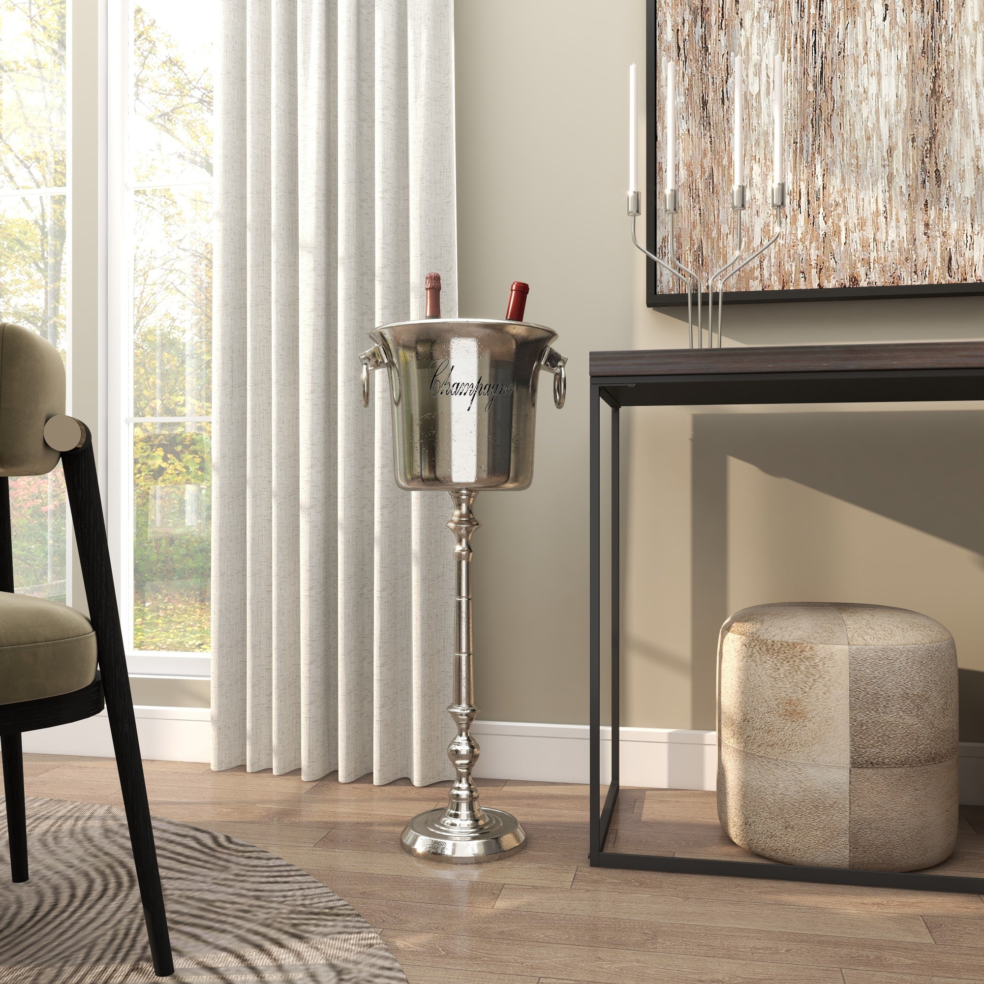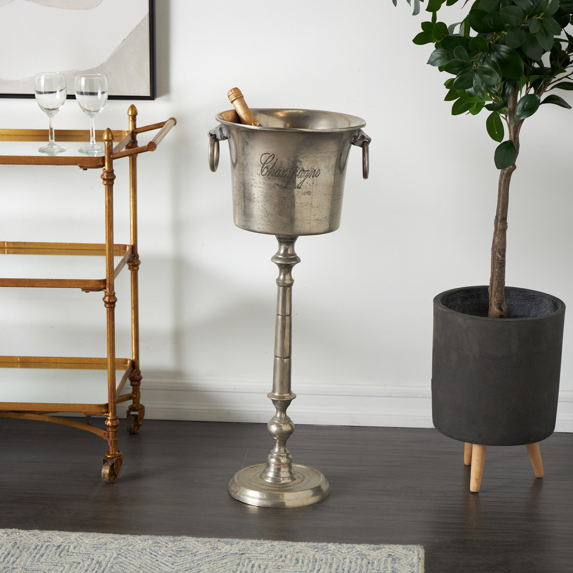 Place the ice storage bin in your dining area to enjoy chilled beverages with style and functionality. Designed with felt or rubber stoppers at the base that prevent scratching furniture and table tops, as well as sliding around. This item ships in 1 carton. Portable drink cooler, perfect for chilling wine, beer, and cocktails anywhere. Aluminum ice bucket makes a great gift for any occasion. Suitable for indoor use only. Some assembly required. Maximum weight limit is 10 lbs. Made in India. This is a single bucket. Traditional style. ice bucket can hold 2 average wine bottles. Showcases "Champagne" in cursive typography.