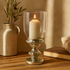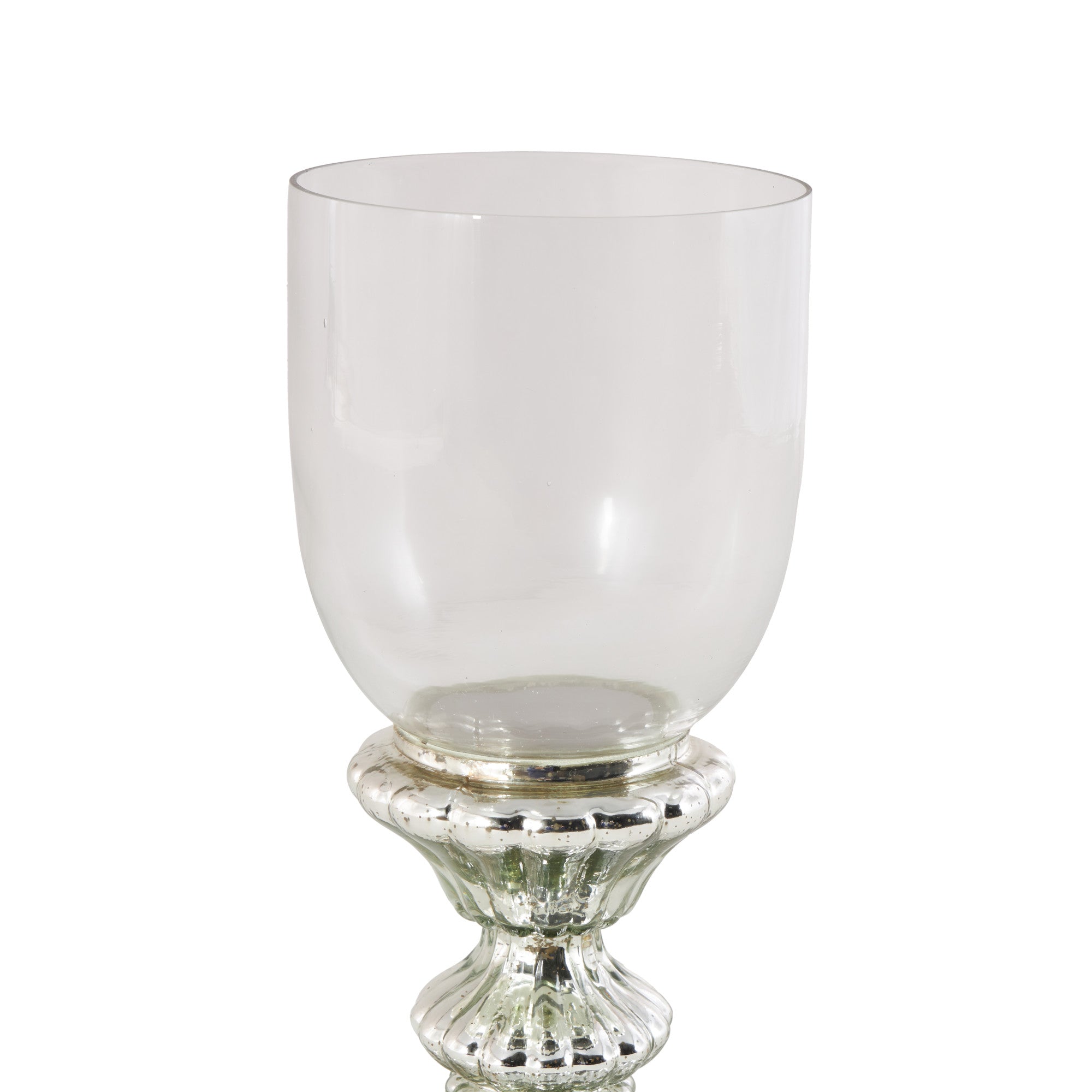•The glass hurricane lamp boasts an intricate turned column design and shimmering faux mercury finish, adding to its sleek elegance