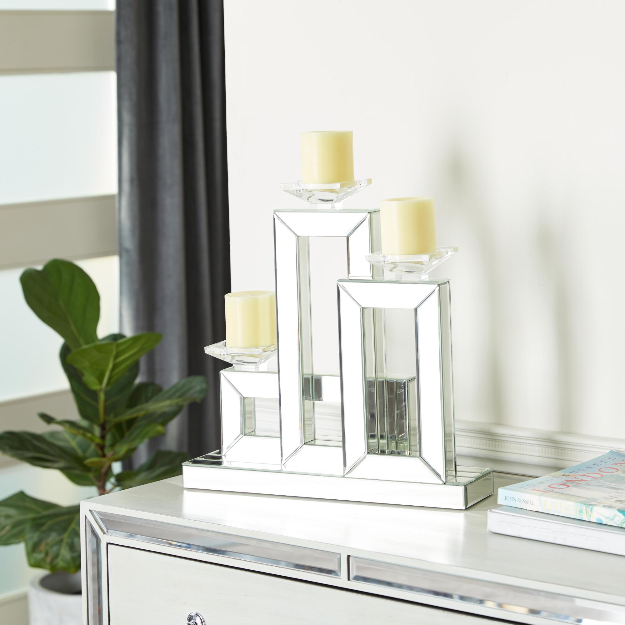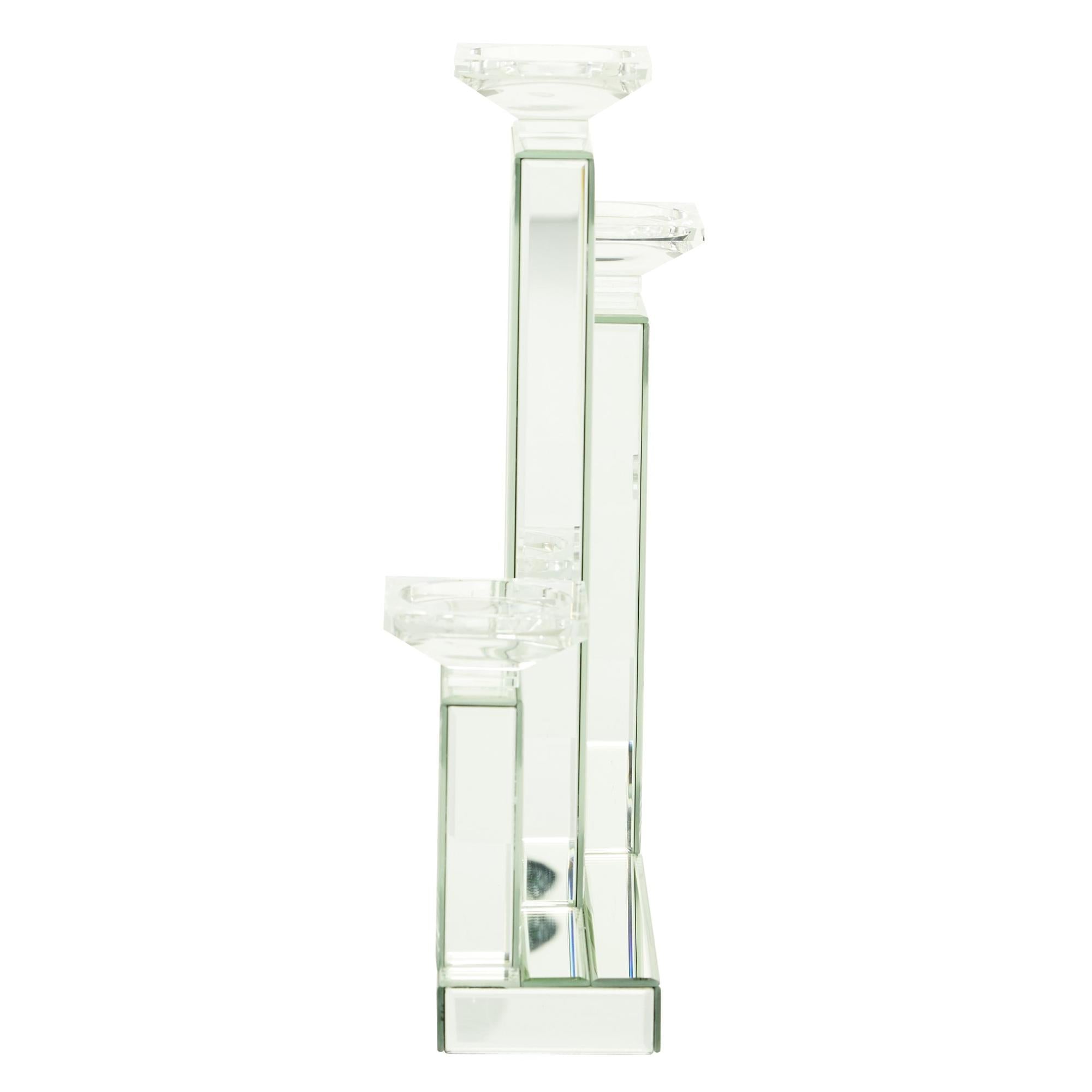 •The mirrored tabletop candelabra showcases square holders and a base with overlapping rectangular shapes, adding depth and sophistication to your décor