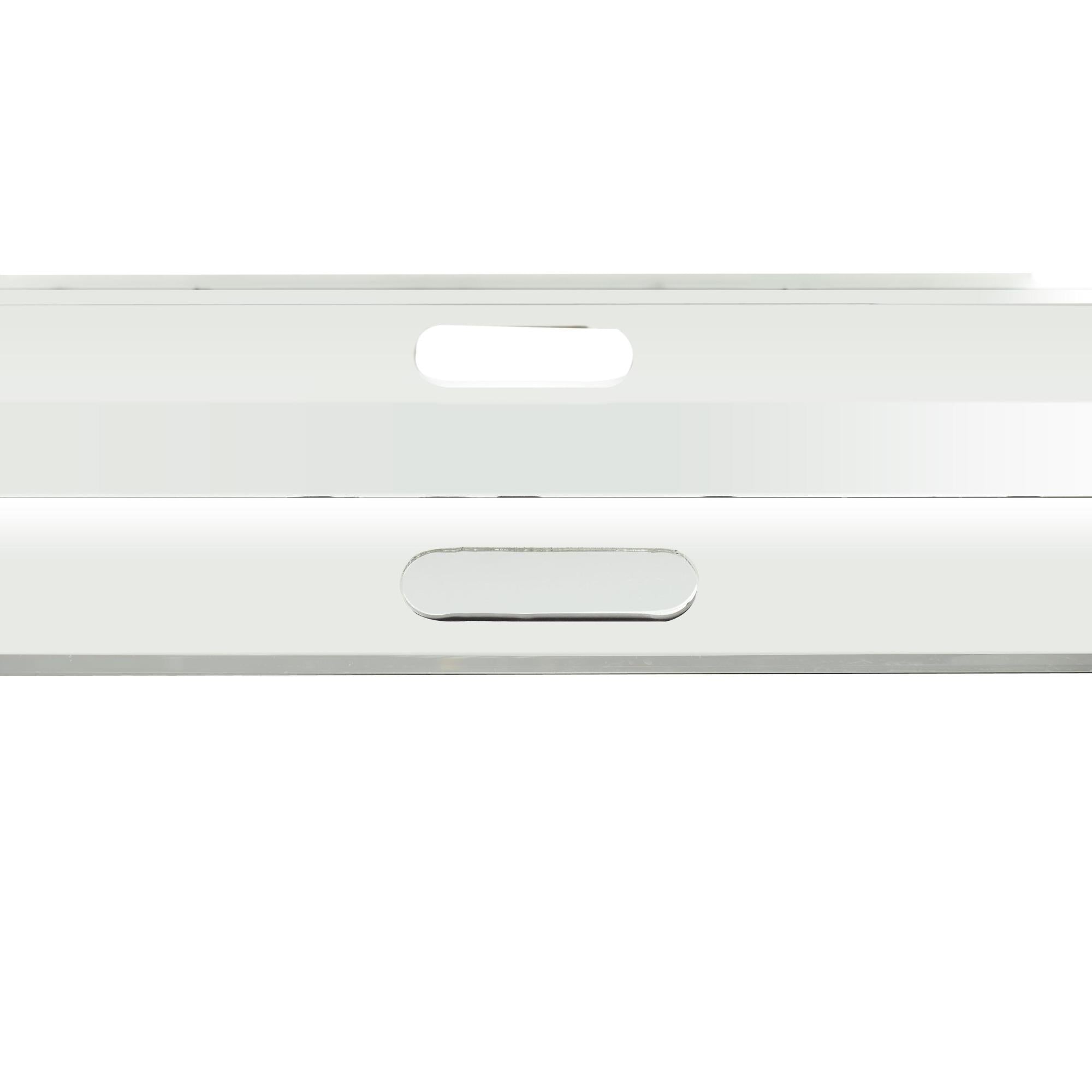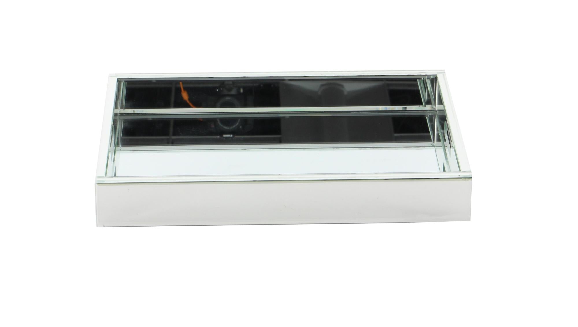 •Mirrored storage tray showcases a rectangular open crate design with oval cut-out handles that enhance its luxurious appeal