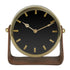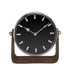 •The modern clock for home features a welded stainless-steel body with a tempered glass cover and mounted on a stitched faux leather stand