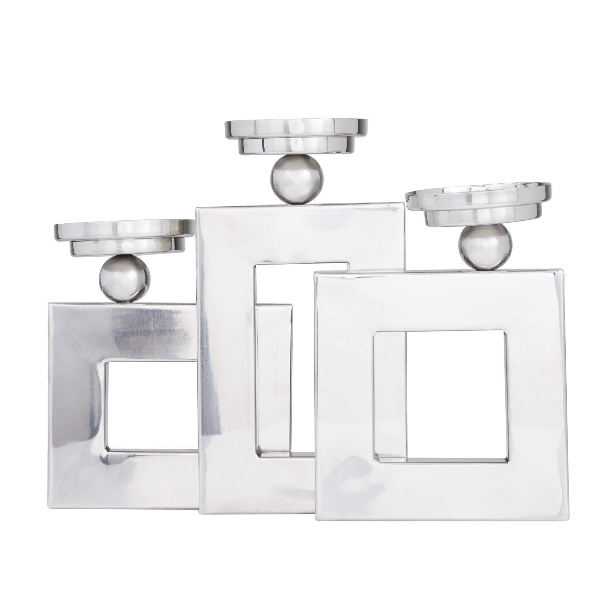 •Polished candle holders for centerpiece boasts round candle plates with ball accent stands and varying-sized rectangular bodies, all designed in an open style for a contemporary look