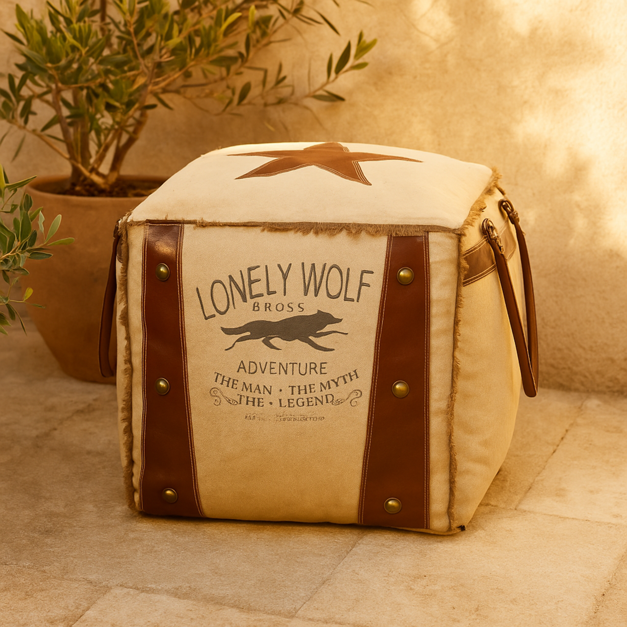 •The room pouf is crafted from durable canvas and leather materials, ensuring longevity and style
