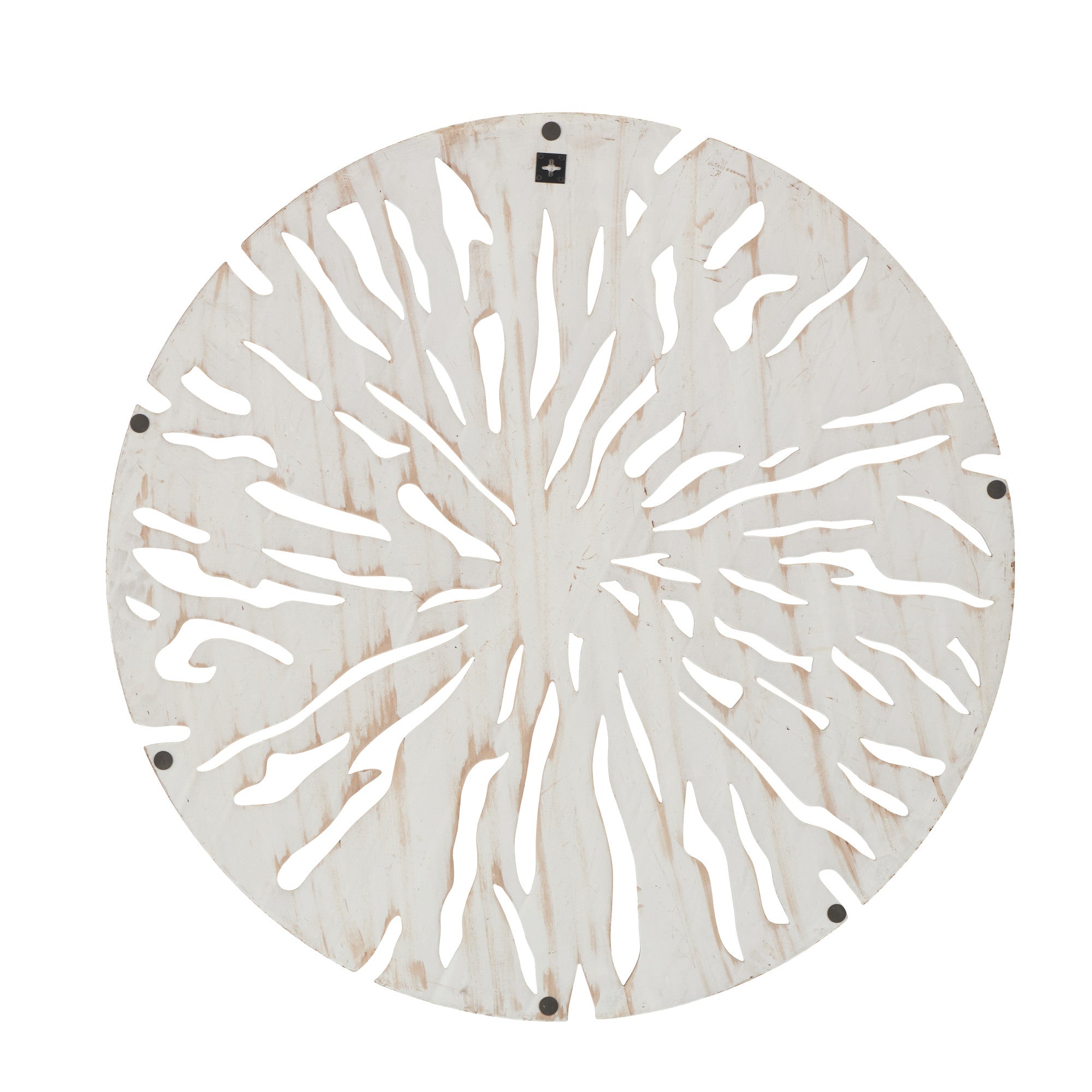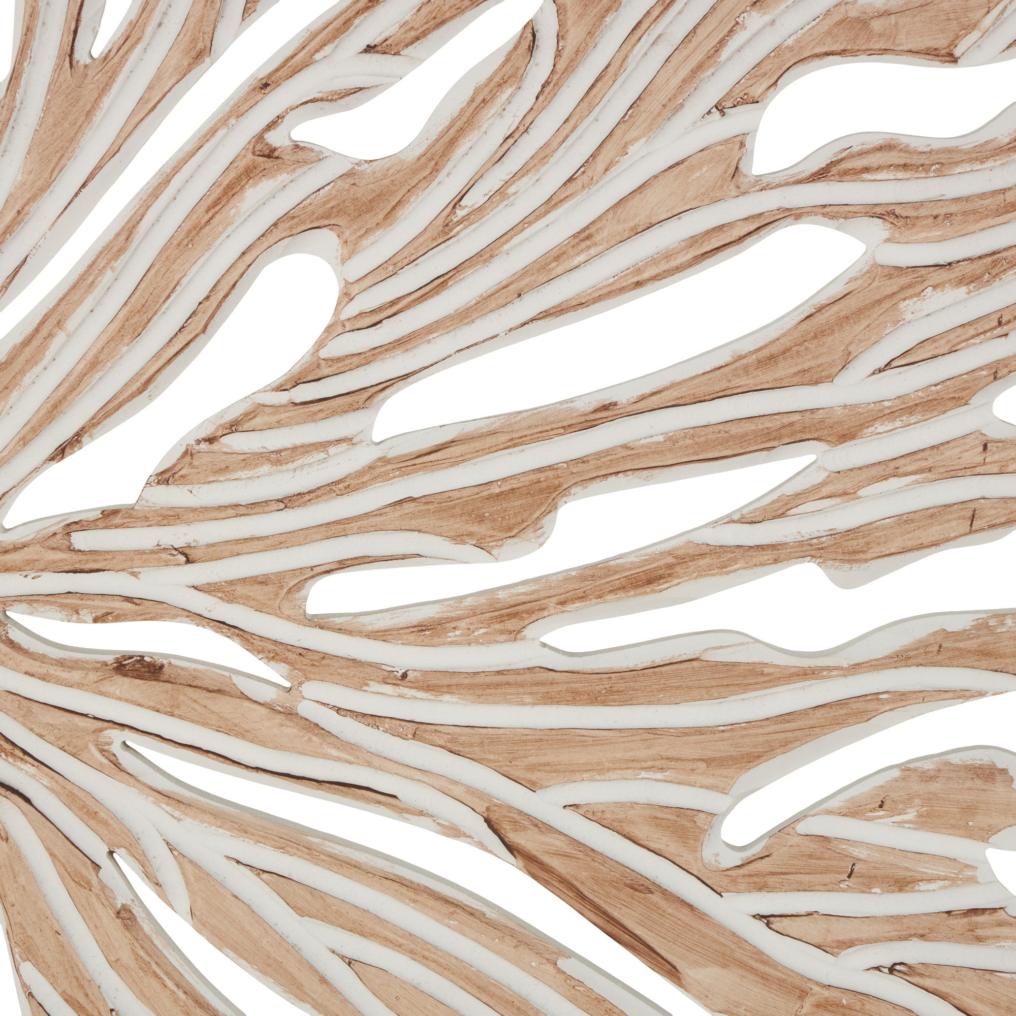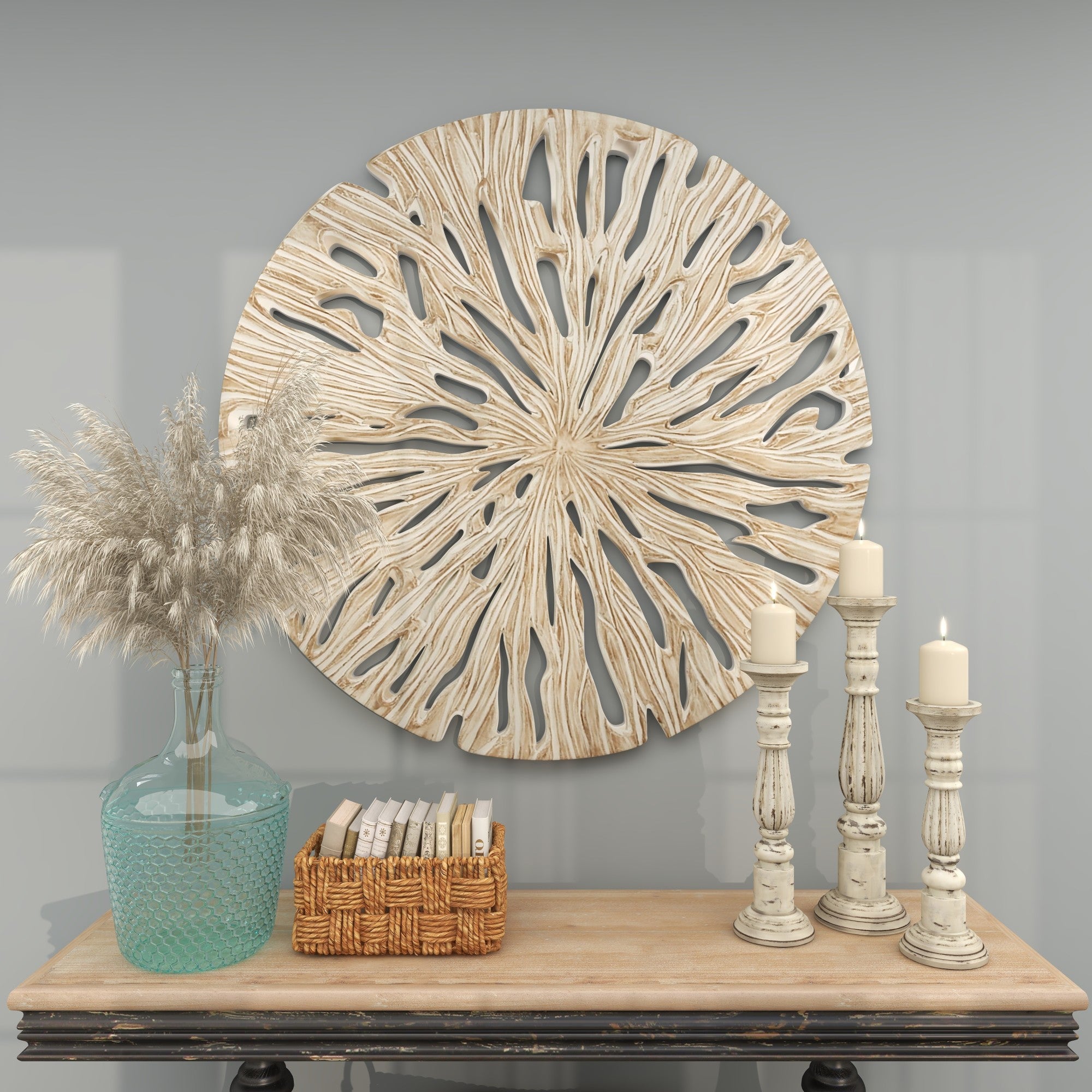 •Wood wall decor features an intricate coral-inspired design carved into a large round plate, adding an organic touch to any space