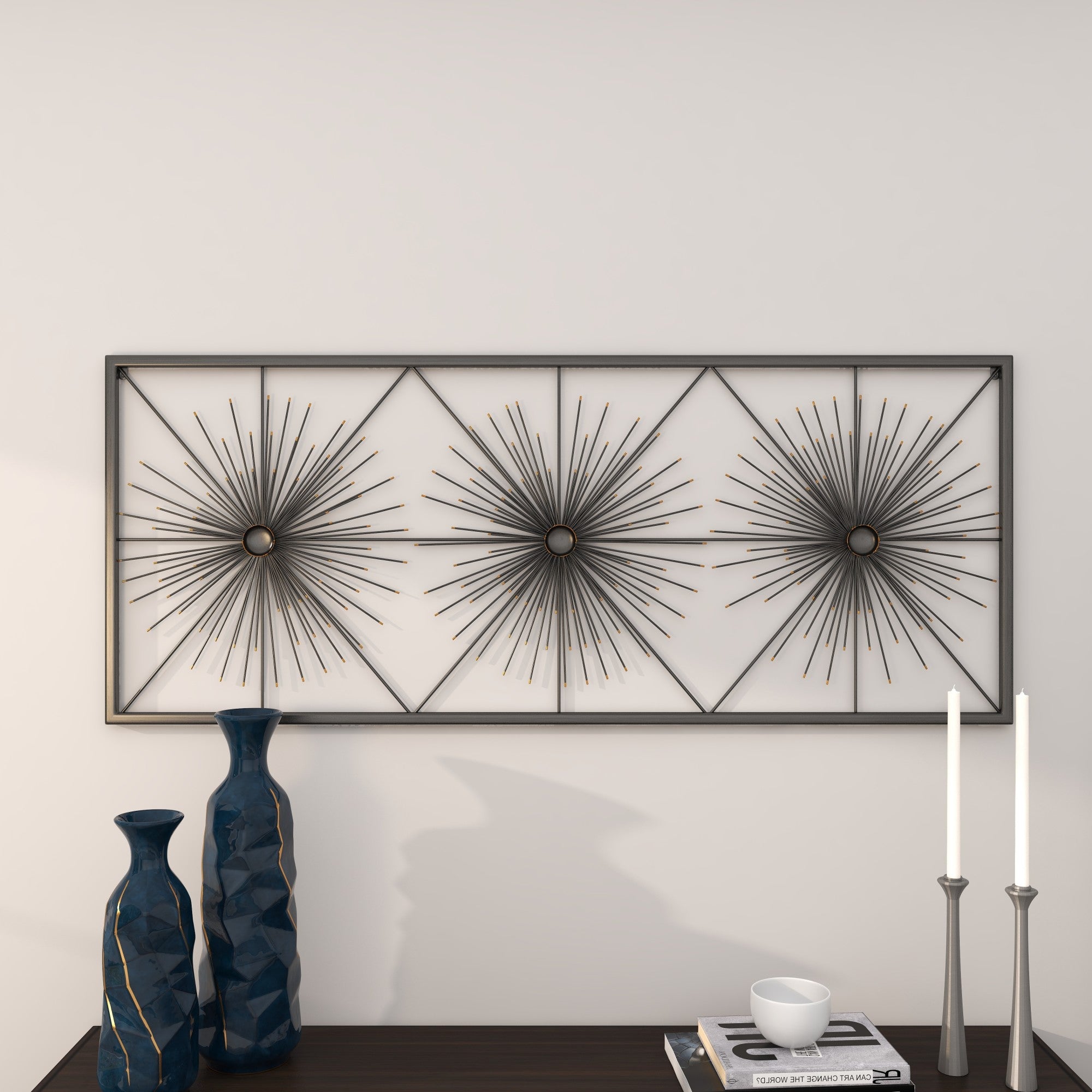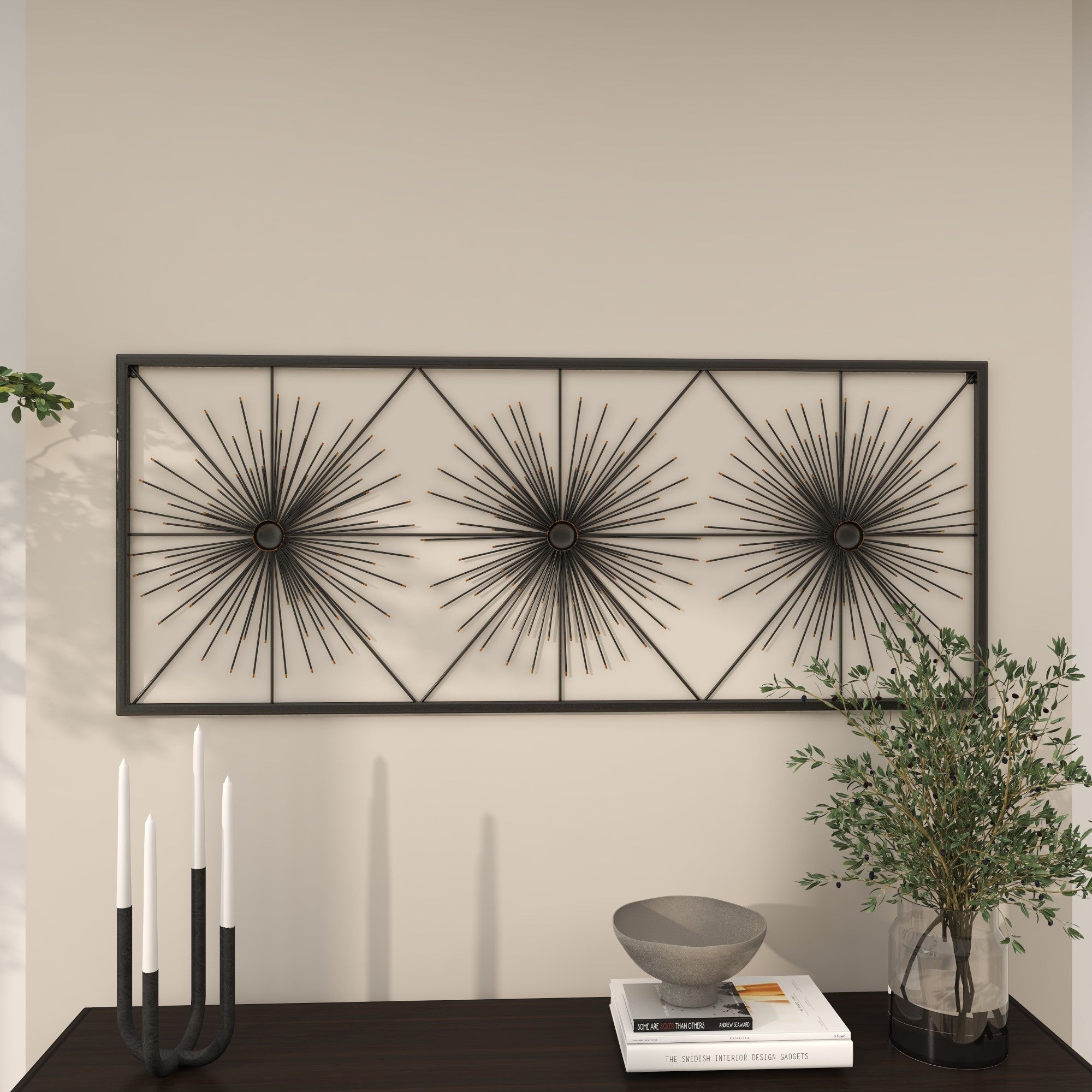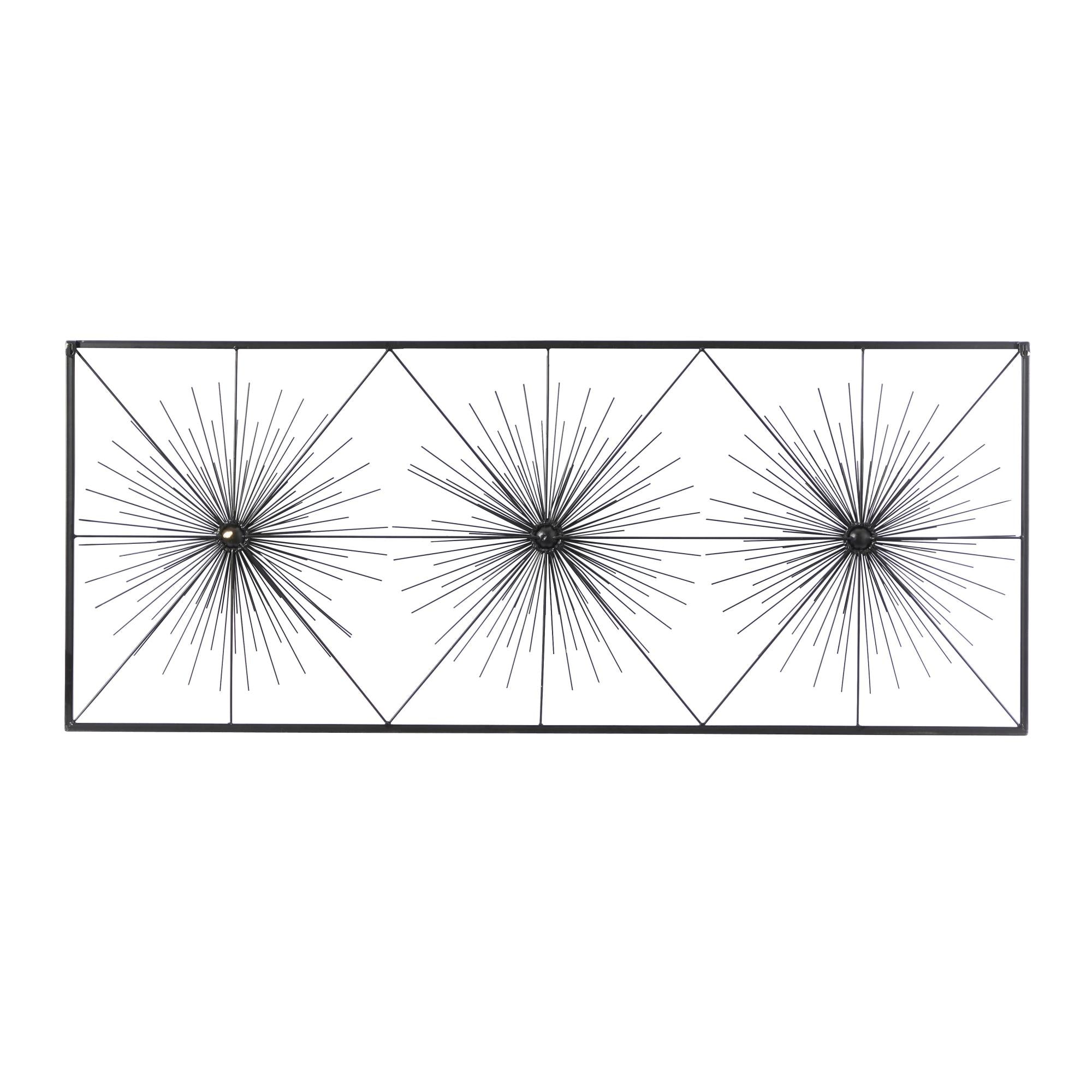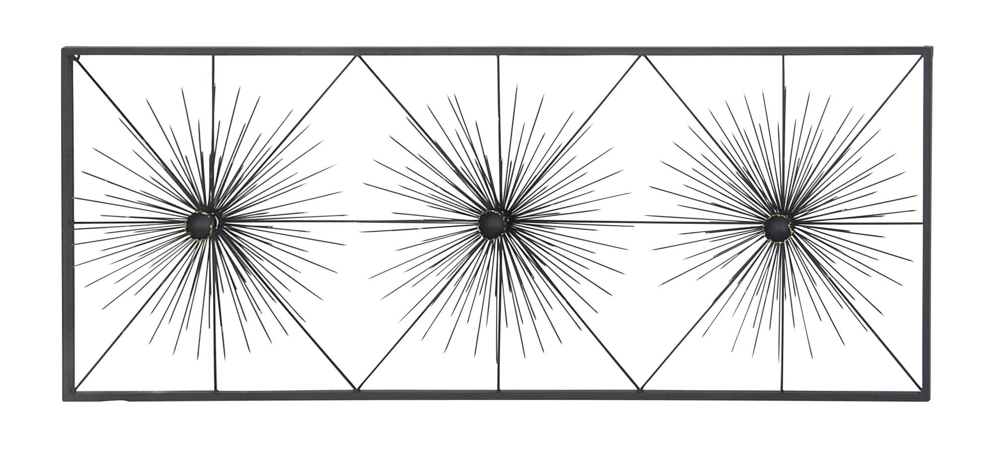 •As an impressive feature, this iron wall decor showcases 3-D inspired starburst sculptures within a slim rectangular border and an open-styled back frame