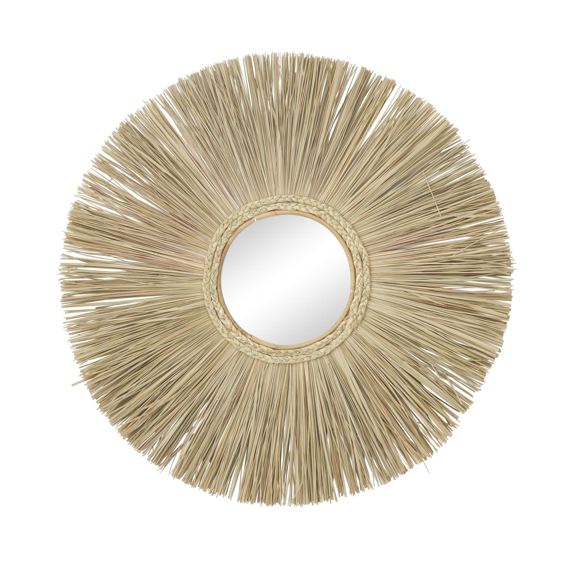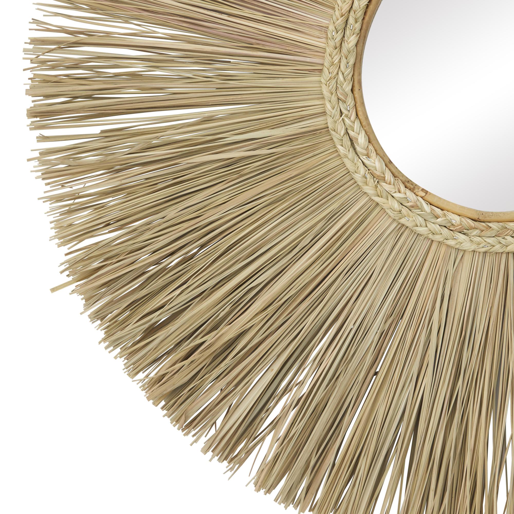 •The reed frame encloses the mirror, while the wooden backing constitutes the structure of this bohemian accent wall mirror