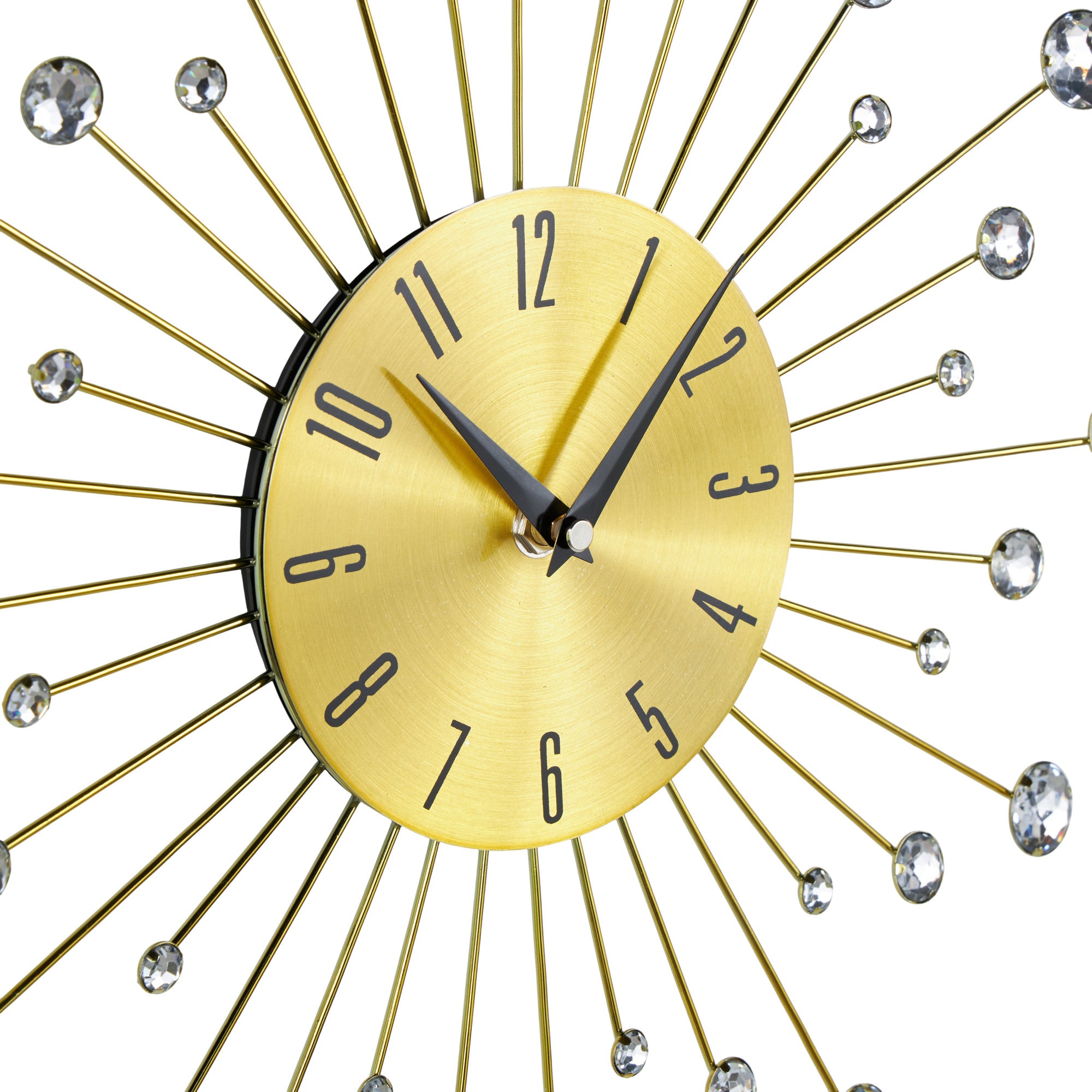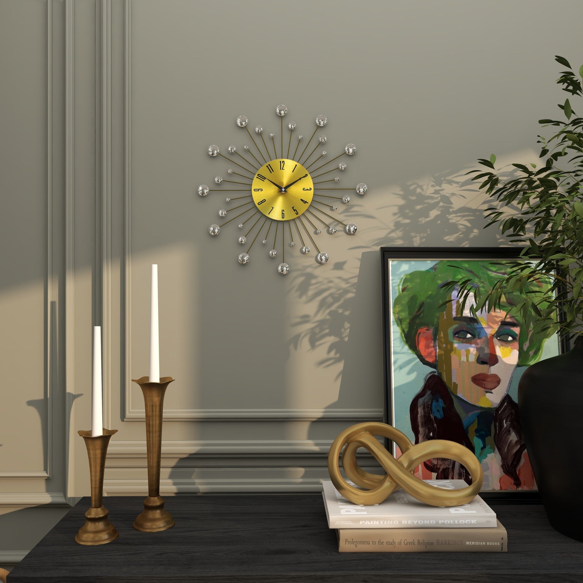 •The satin oversized wall clock showcases a sunburst design with slim rods adorned with round crystals extending from the round clock face