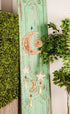•This eclectic wall art windchime is carved from mango wood to form moon, sun, and star shapes that are hand painted and adorned with welded iron bells and molded glass beads