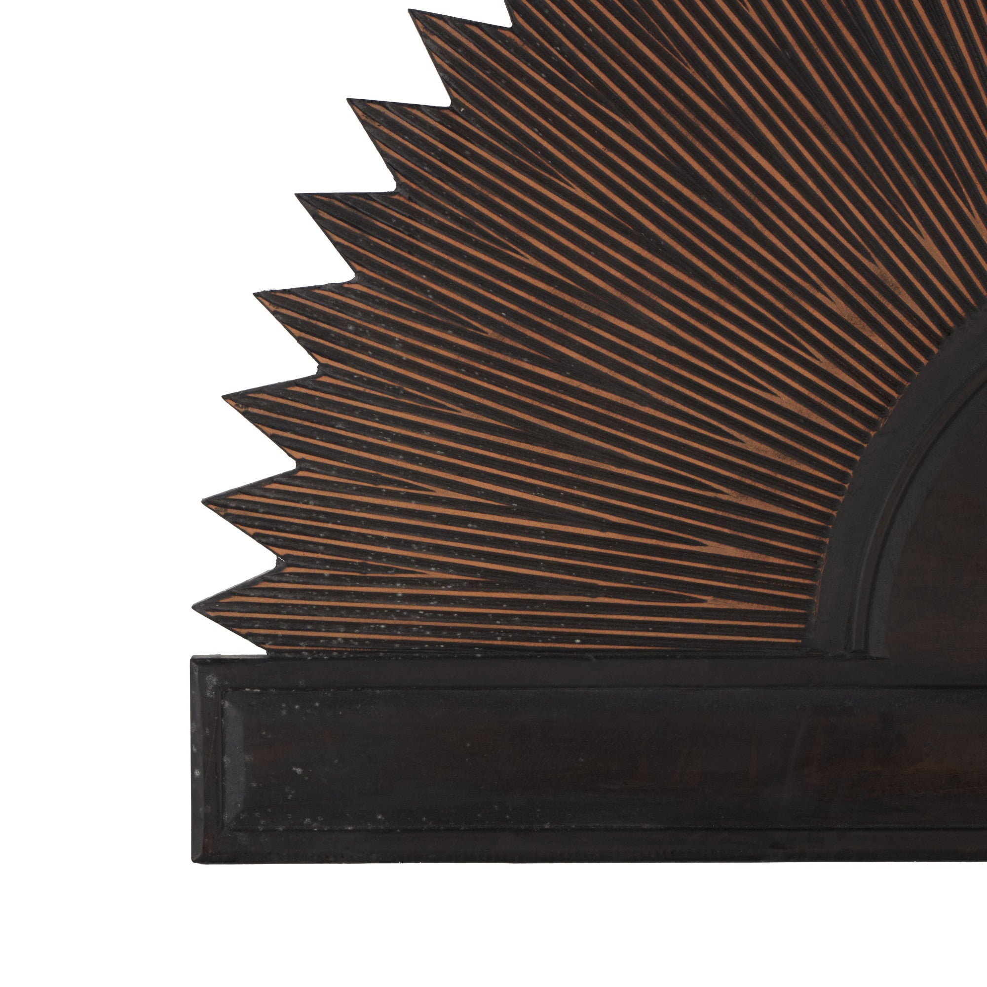 •This wooden wall sculpture boasts a sun design with intricate copper accents, adding a touch of warmth and artistic flair