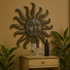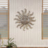 •Weathered wall art for living room features a unique sun design with a round face and curved sun rays adorned with line patterns, embodying an eclectic aesthetic