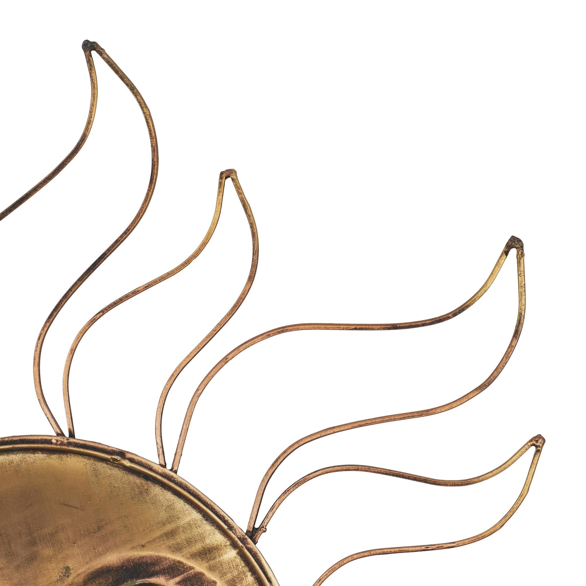 Place this on any blank wall space adding both texture and depth to your home. This sun wall sculpture can breathe life and textural dimensions into any wall space, making it an ideal addition to your living rooms and bedrooms. This item ships in 1 carton. Iron wall decor makes a great gift for any occasion. Can be hung vertically using the hanging hooks; nails and screws not included. A great versatile decor for indoor or outdoor display but are not rust or weather resistant. This item ships fully assembled in one piece. Made in India. This is a single copper wall sculptures. Eclectic style.