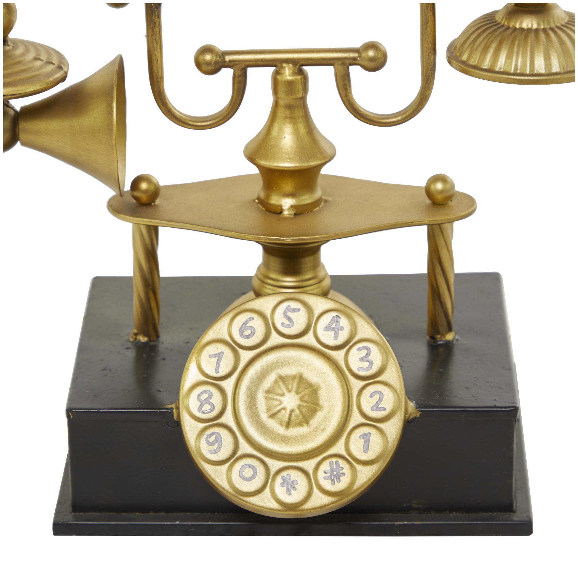 Enhance your living room or bedroom with this telephone home decor statue on your nightstand, side table, or console table. Designed with felt or rubber stoppers at the base that prevent scratching furniture and table tops, as well as sliding around. This item ships in 1 carton. Please note that this item is for decorative use only. Iron sculpture makes a great gift for any occasion. Suitable for indoor use only. This item ships fully assembled in one piece. Made in India. This is a single statue. Vintage style.