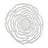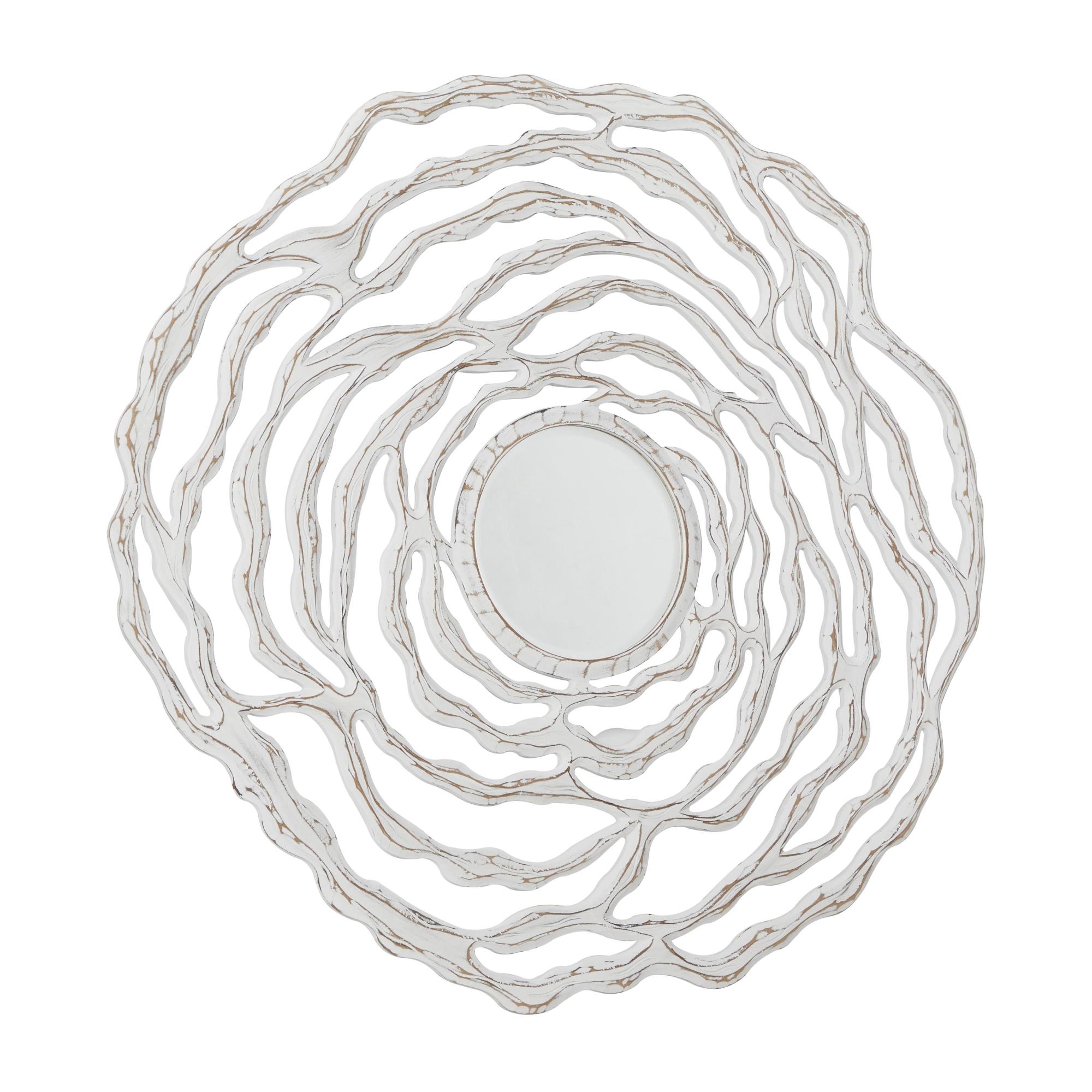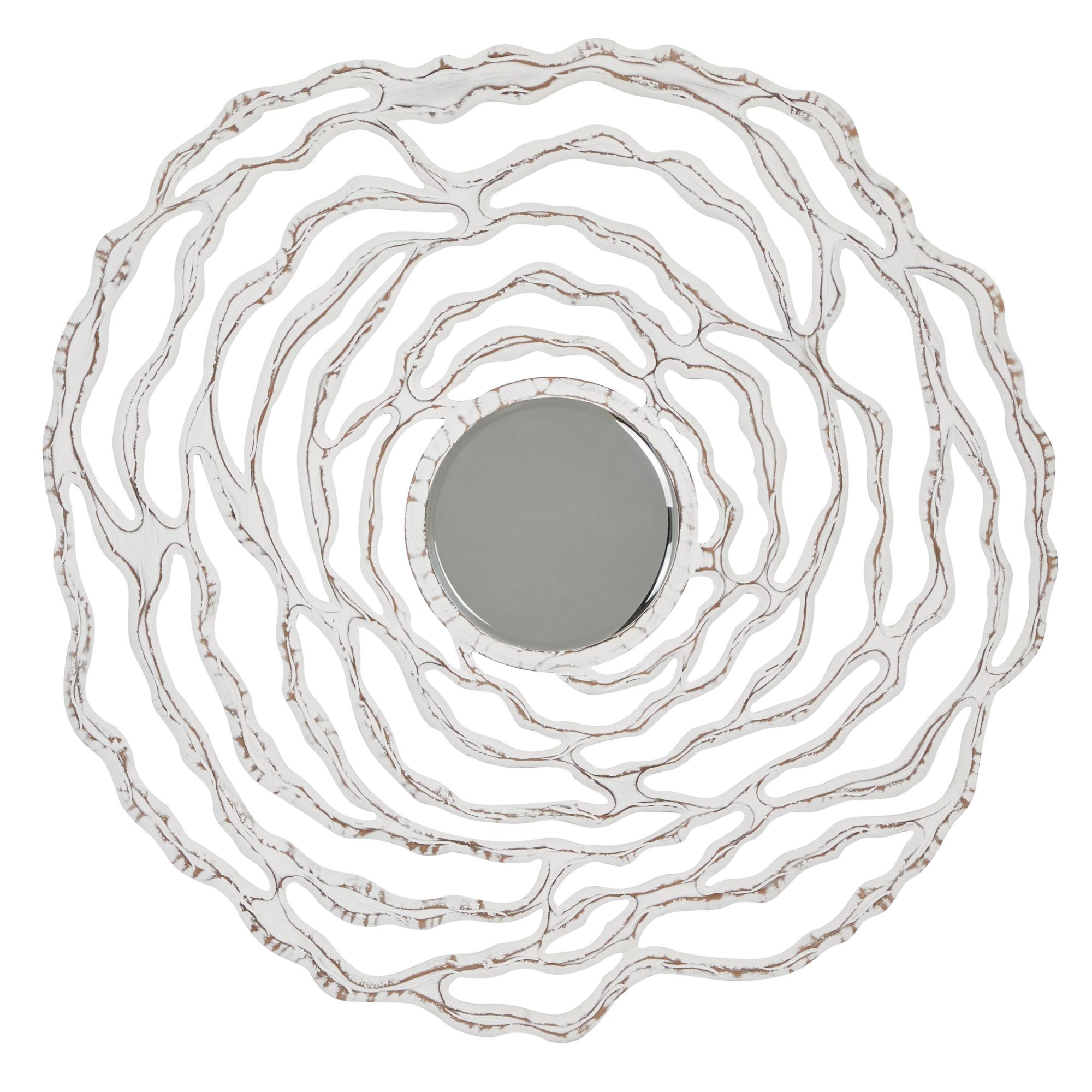•The distressed mirror for wall has a round, abstract shape with a circular center