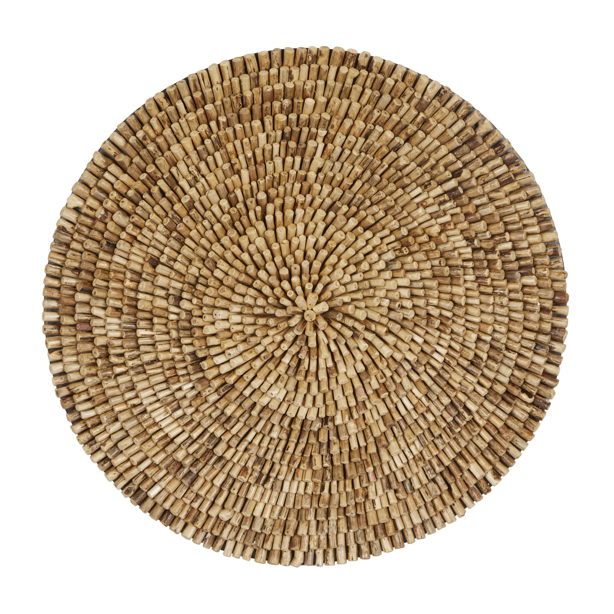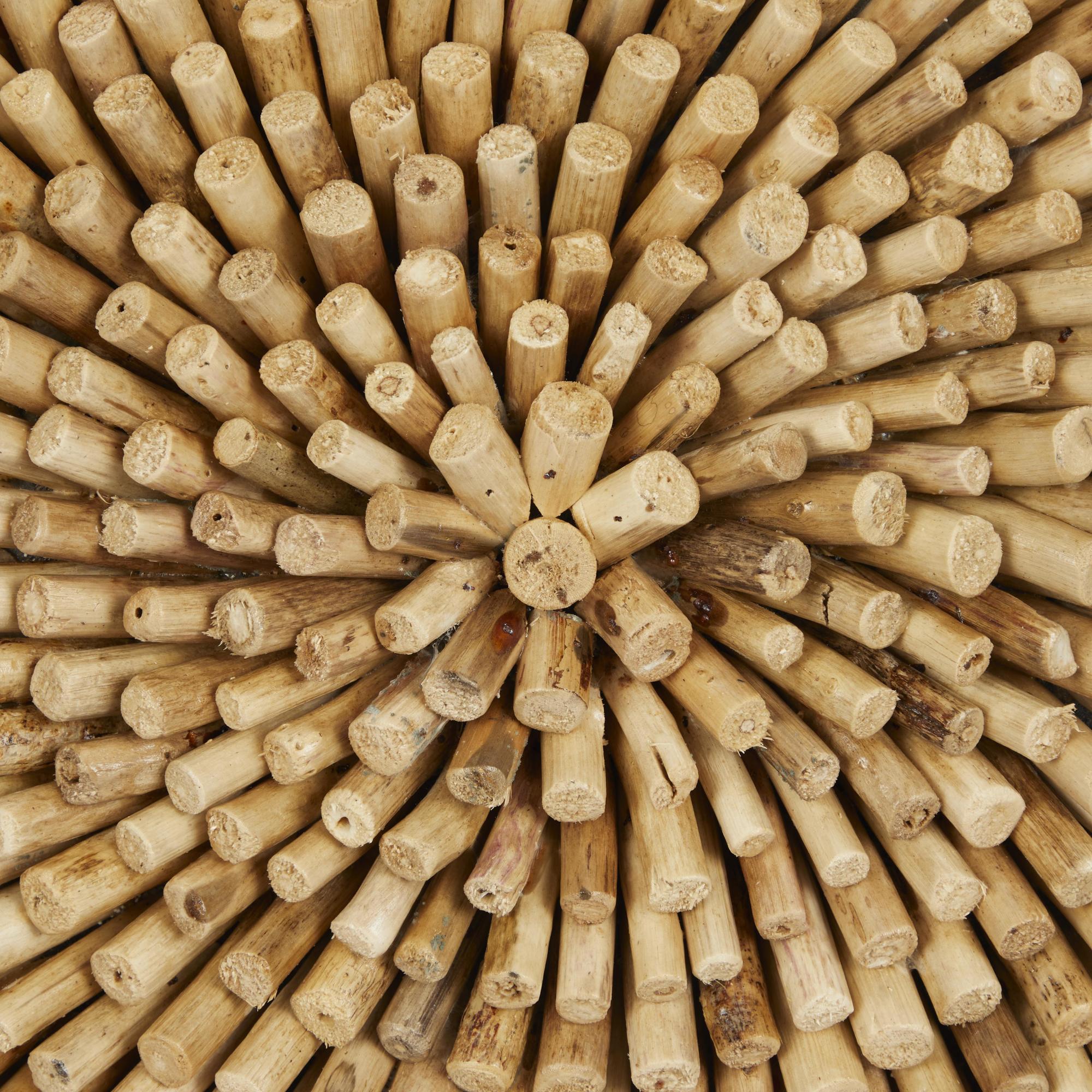 •Textured wall art for living room presents an intriguing large round shape made up of small wooden dowels arranged in an outward explosion akin to a firework formation
