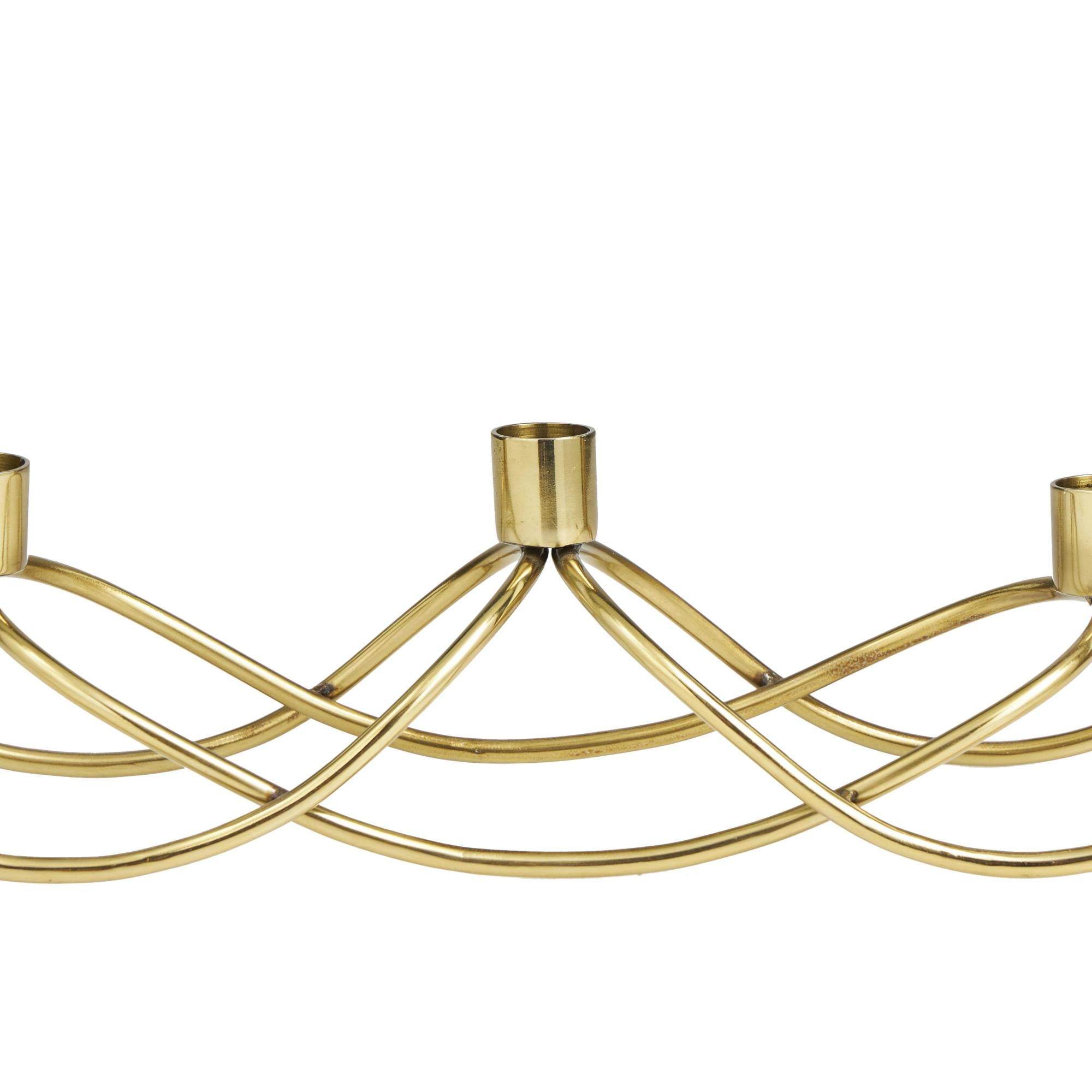 •The polished tabletop candelabra features curved and intertwined metal pieces with slim round holders, highlighting a simple yet elegant design