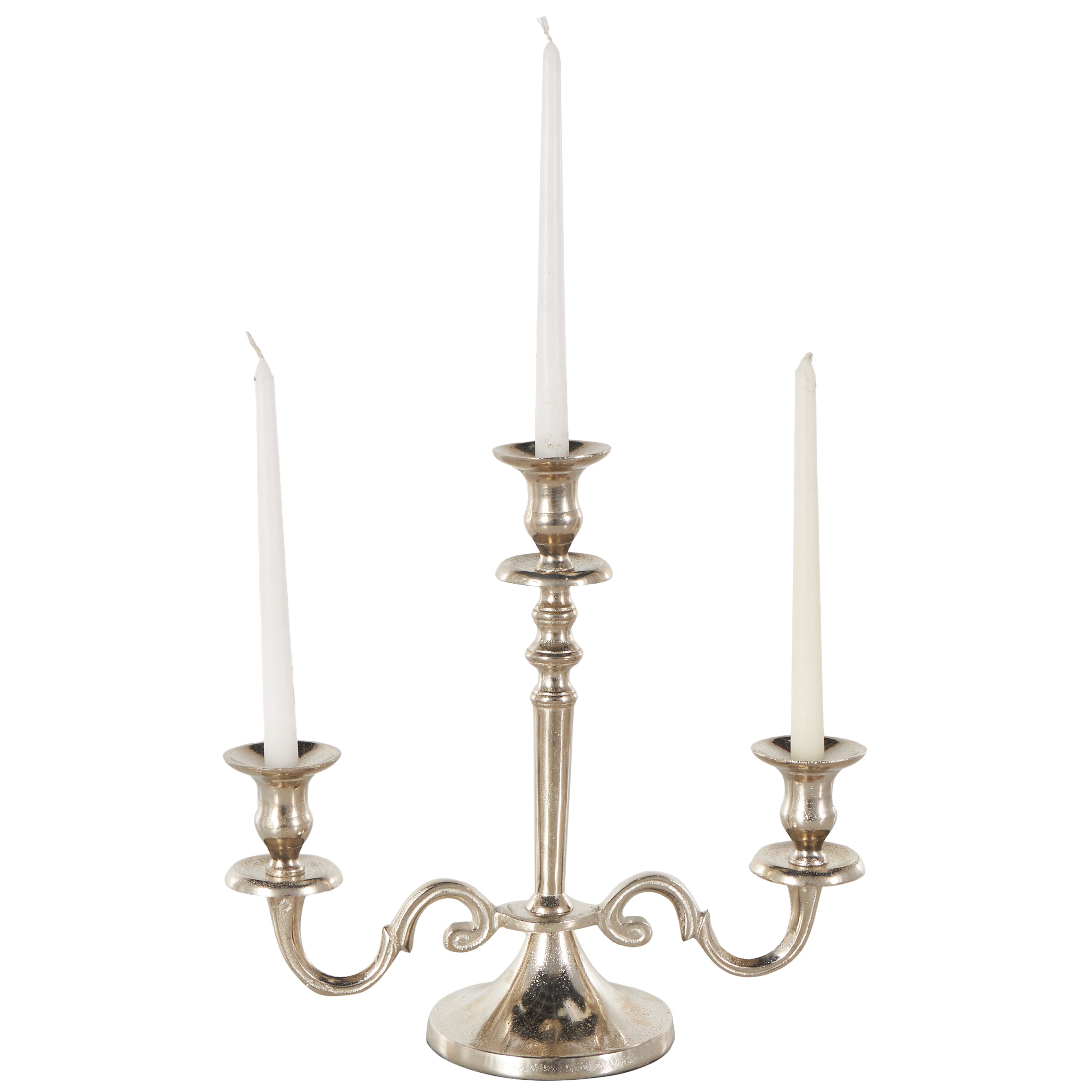 Place the candlestick holder on a flat surface like a dining table or mantel to create a warm atmosphere with traditional charm. Designed with felt or rubber stoppers at the base that prevent scratching furniture and table tops, as well as sliding around. Can hold 3 taper candles, not included. This item ships in 1 carton. Aluminum candelabra makes a great gift for any occasion. Suitable for indoor use only. This item ships fully assembled in one piece. Made in India. This is a single candlestick holder. Traditional style.