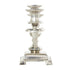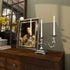 •This polished tabletop candelabra boasts scroll patterns with a tapered post and a round beveled base for added detail