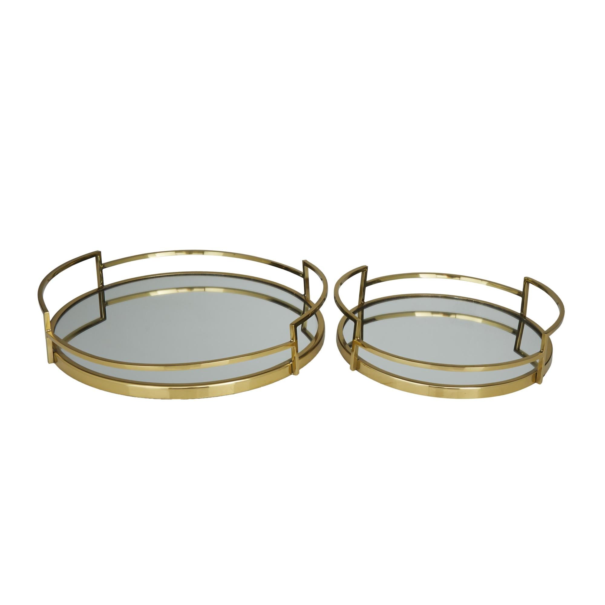 •The stainless-steel set of 2 trays boasts reflective mirror surfaces with raised bar handles that add a touch of luxury