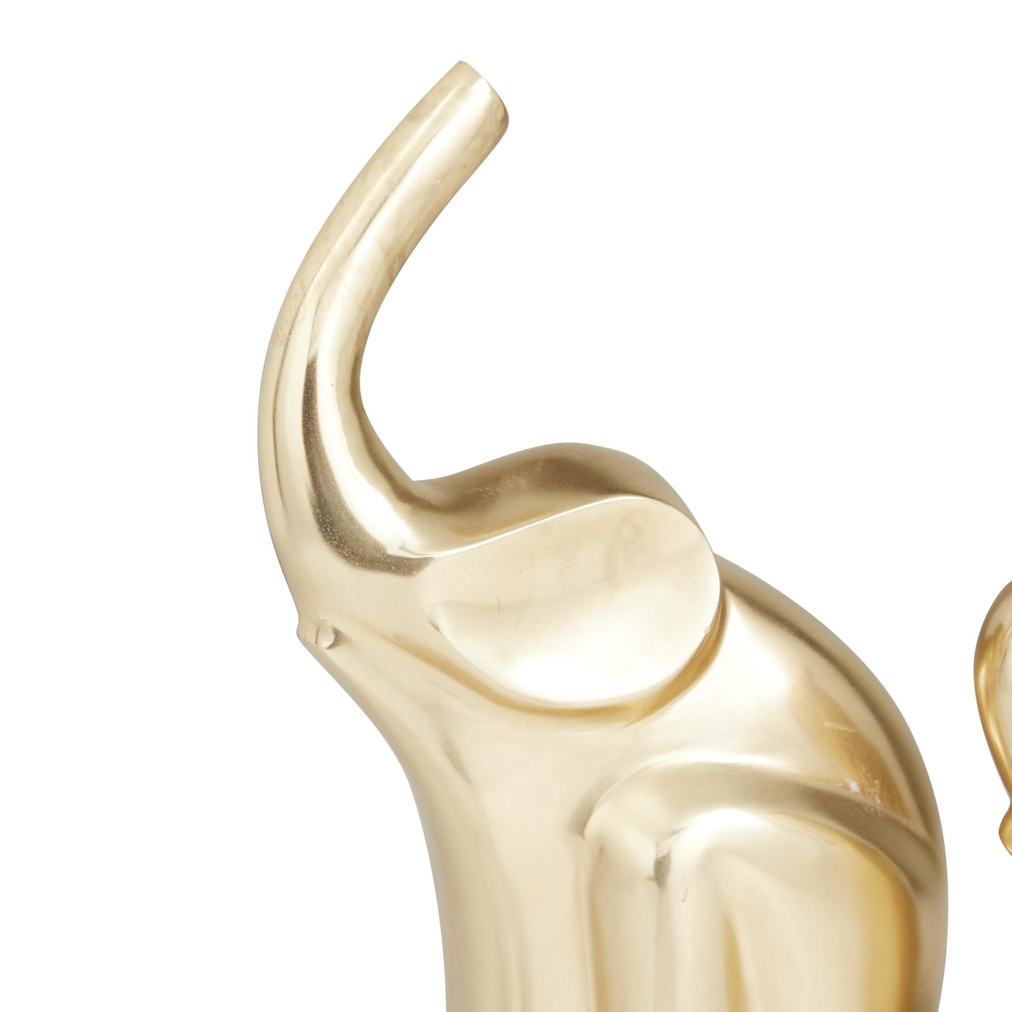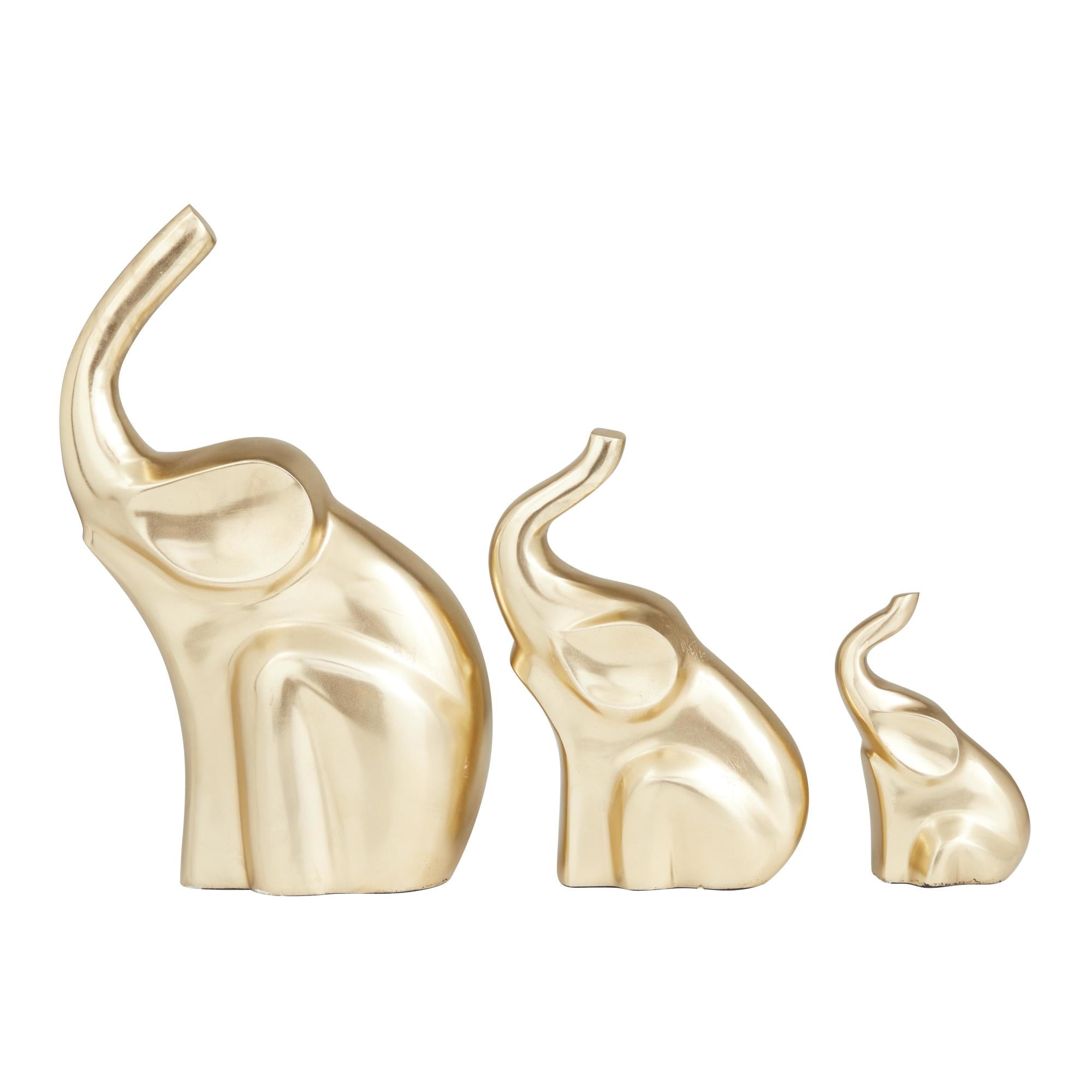 Adorn your surface space by incorporating sculpture into your decor to add depth and texture in your home. An artistic display to showcase your personality and enhance the look of any open table top space. Perfect for adding a glamorous touch to your living room, this elephant set of 3 home decor statues can be styled on shelves or tabletops. Designed with felt or rubber stoppers at the base that prevent scratching furniture and table tops, as well as sliding around. This item ships in 1 carton. Please note that this item is for decorative use only. Aluminum sculpture makes a great gift for any occasion. Suitable for indoor use only. This item ships fully assembled in one piece. Made in India. This aluminum statue comes as a set of 3. Glam style.
