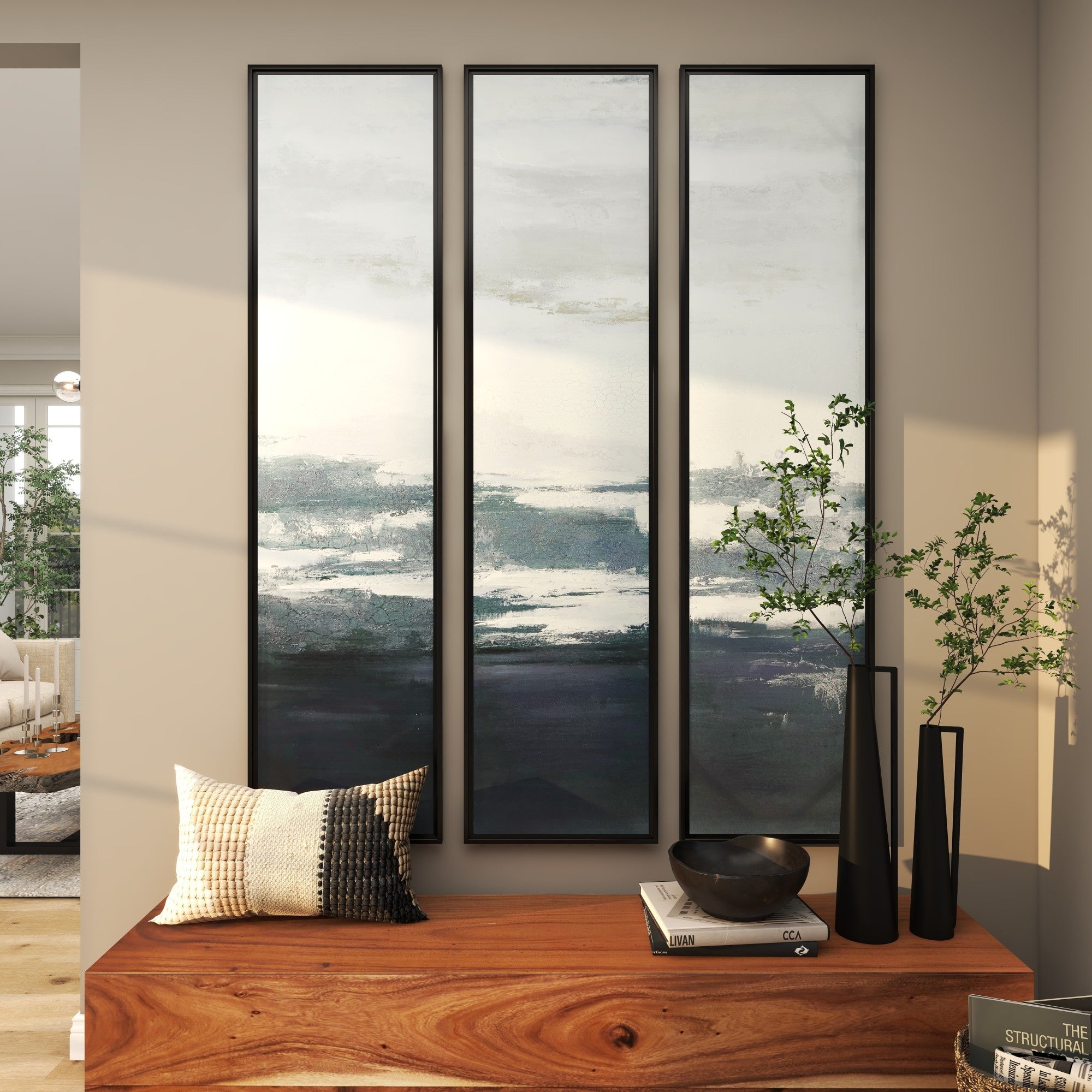 •This canvas set of 3 framed wall arts features a modern abstract painting of an ocean landscape, exuding a classic vibe