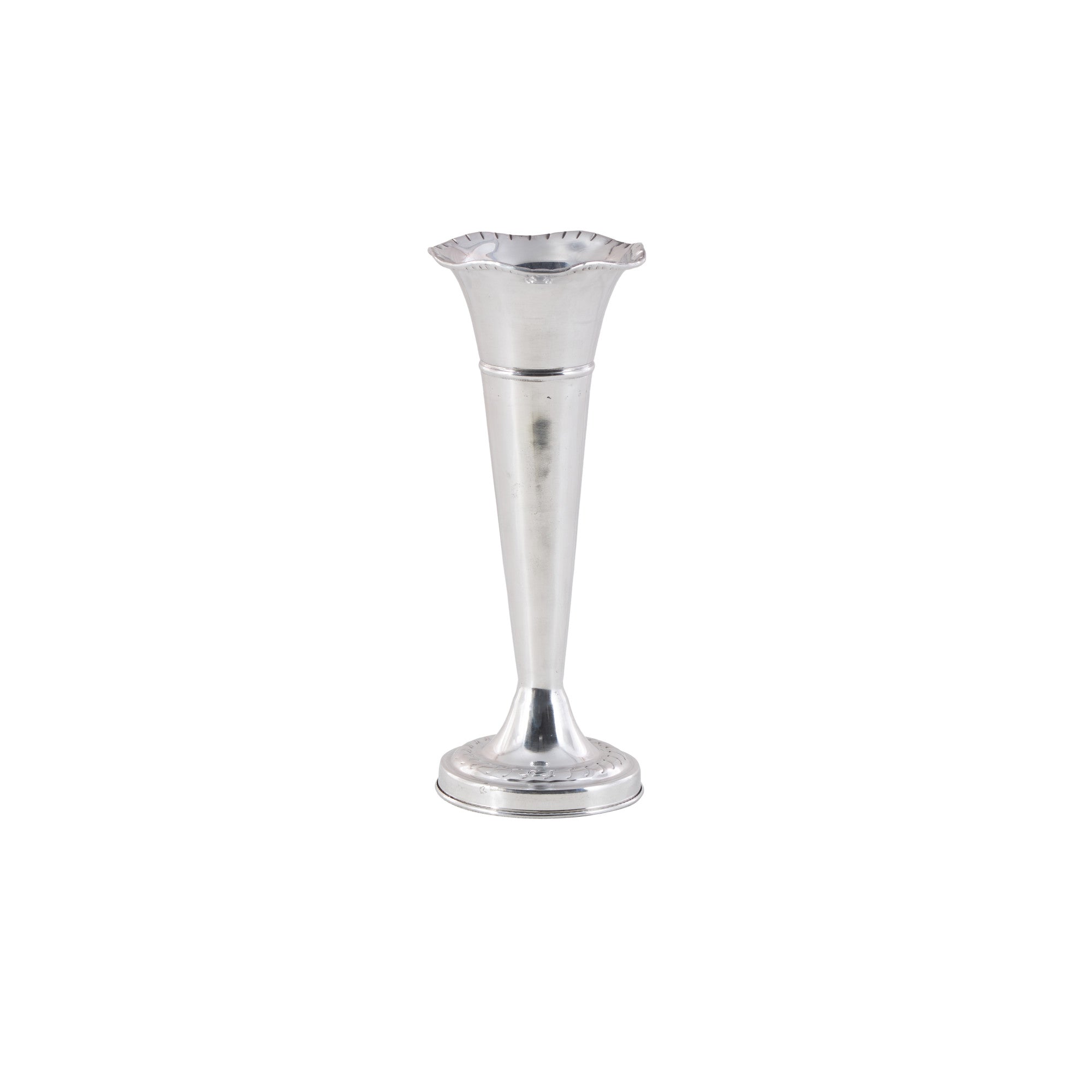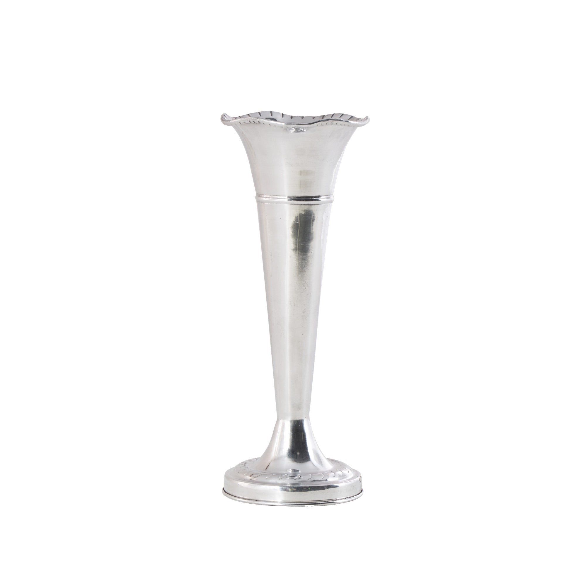 •The aluminum vase features a scalloped rim and stacked round base with decorative grooves