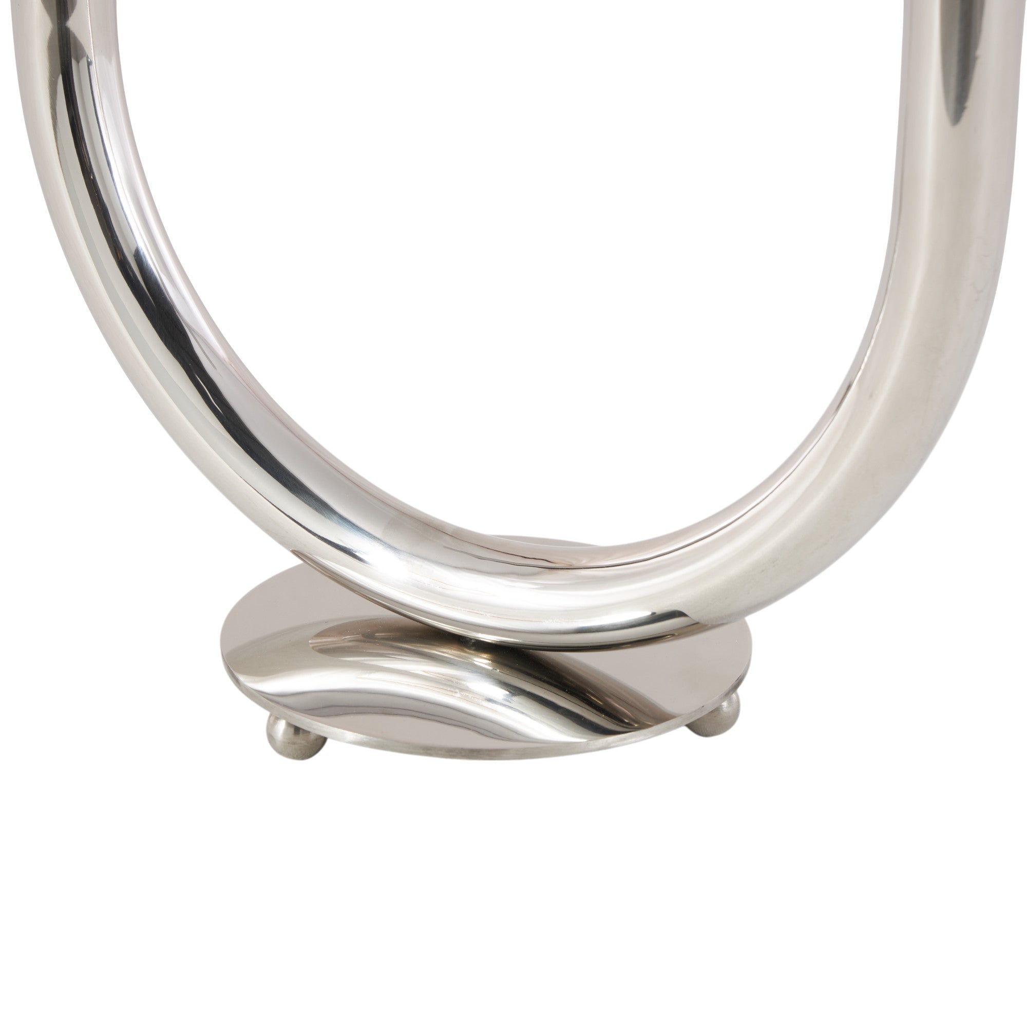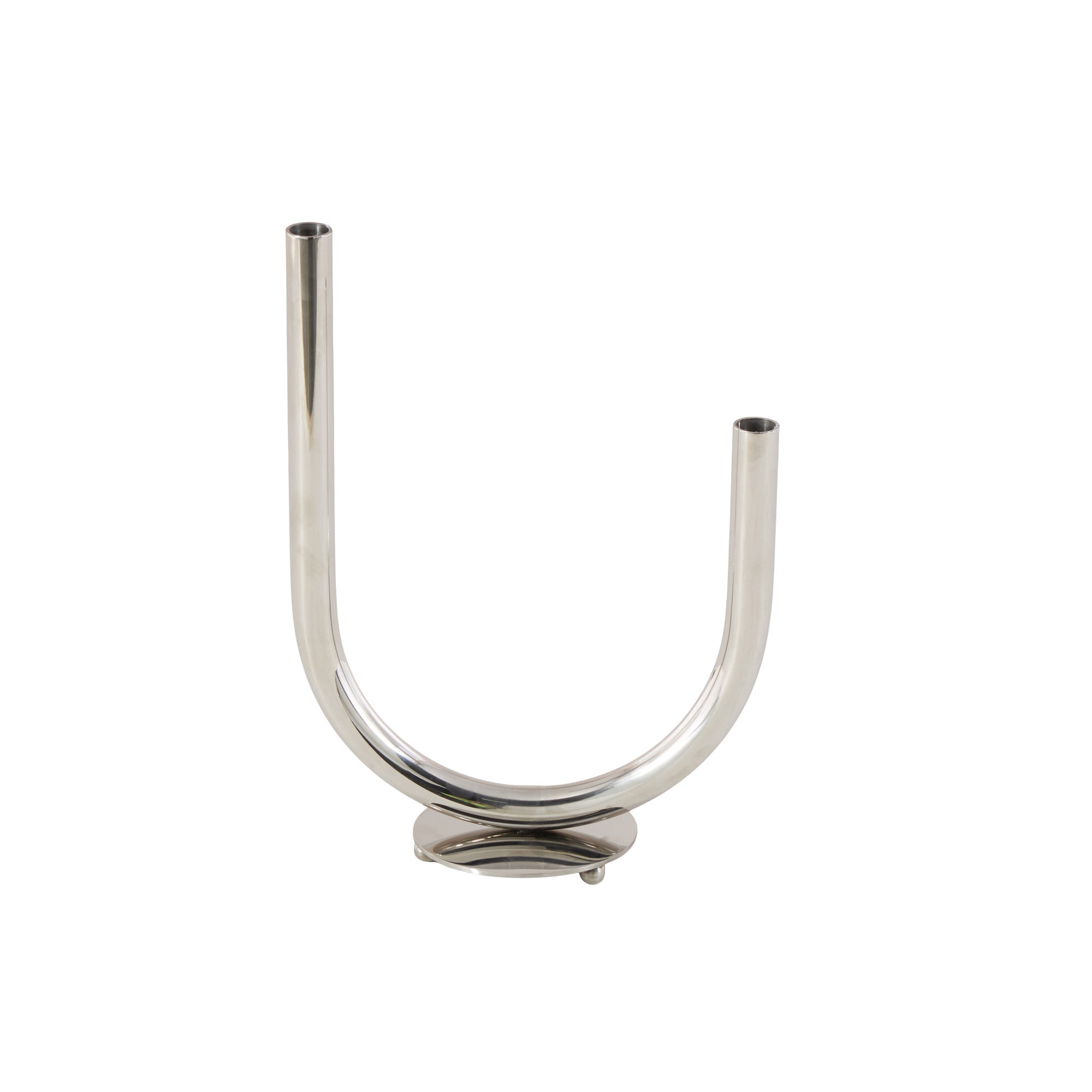 •The polished tabletop candelabra features a sleek U shape atop a rounded base with orb-shaped feet for added charm