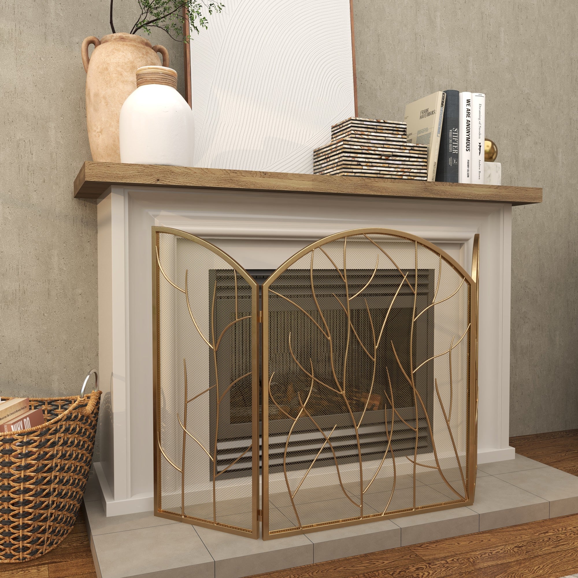 •With its single panel design, the iron fireplace screen showcases sculpted metal branches against a micro mesh backdrop for an artistic flair