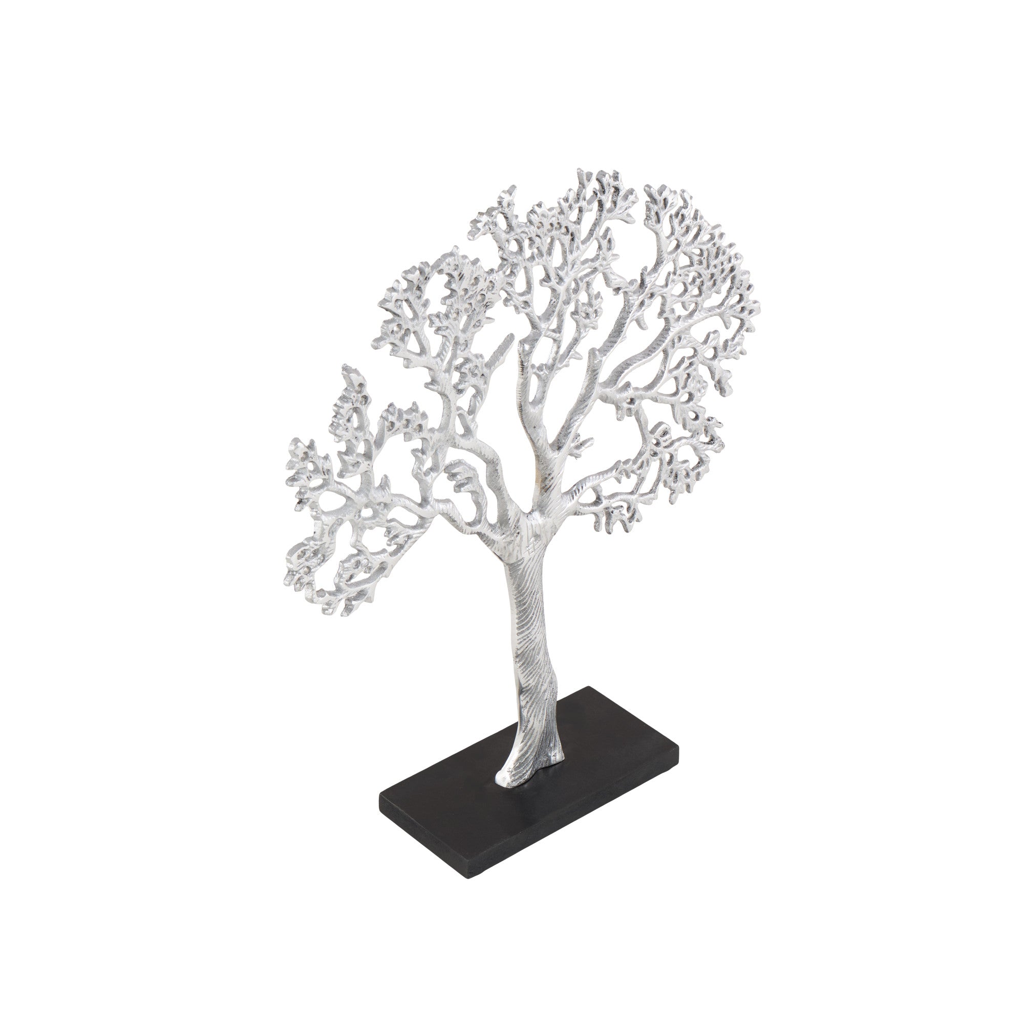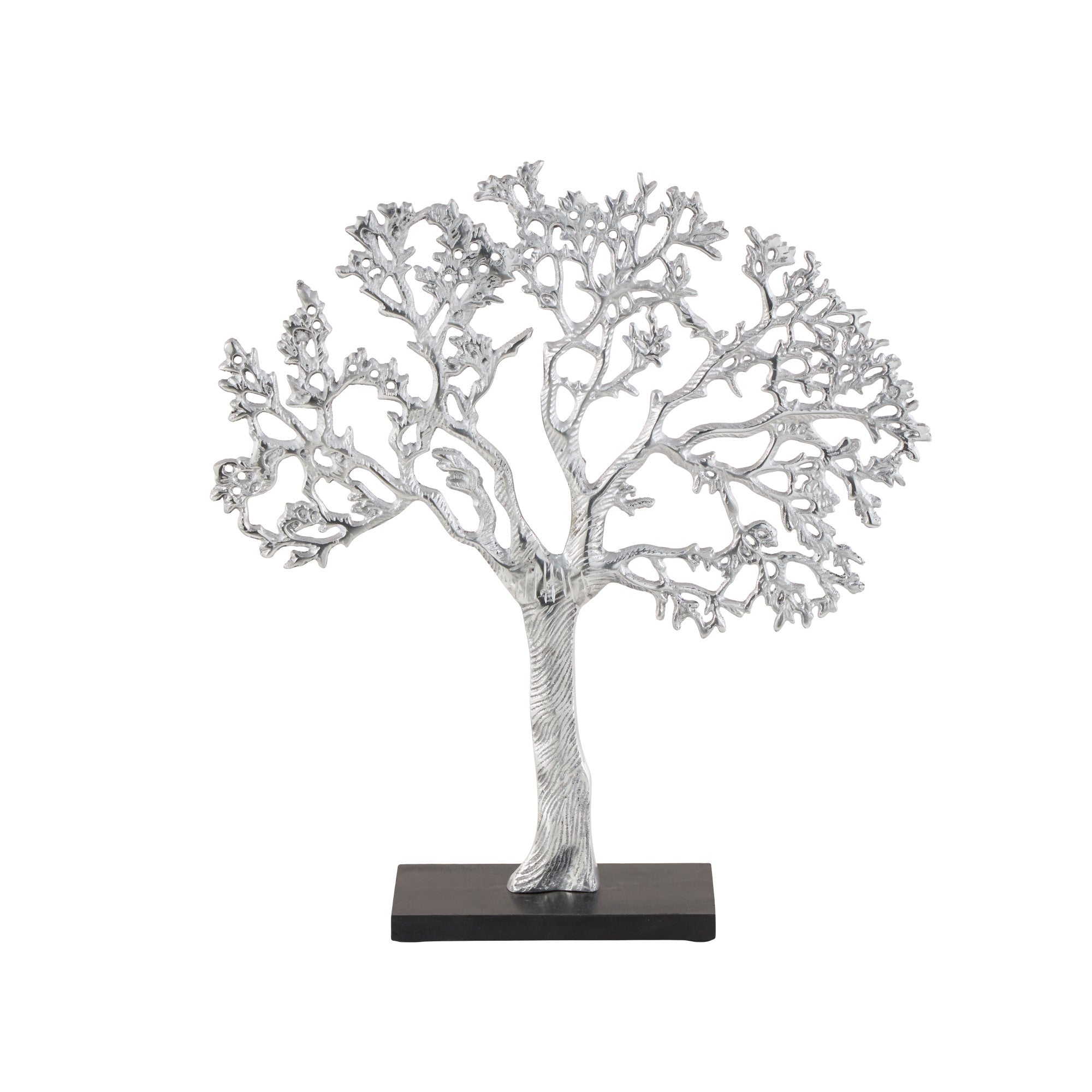 Adorn your surface space by incorporating sculpture into your decor to add depth and texture in your home. Place this tree home decor statue on any accent table or mantel in your contemporary-themed entryway, lobby, or living room to impress guests. Designed with felt or rubber stoppers at the base that prevent scratching furniture and table tops, as well as sliding around. This item ships in 1 carton. Please note that this item is for decorative use only. Adorn your surface space by incorporating sculpture into your décor to add depth and texture in your home. Aluminum sculpture makes a great gift for any occasion. Suitable for indoor use only. This item ships fully assembled in one piece. Made in India. This is a single statue. Traditional style.