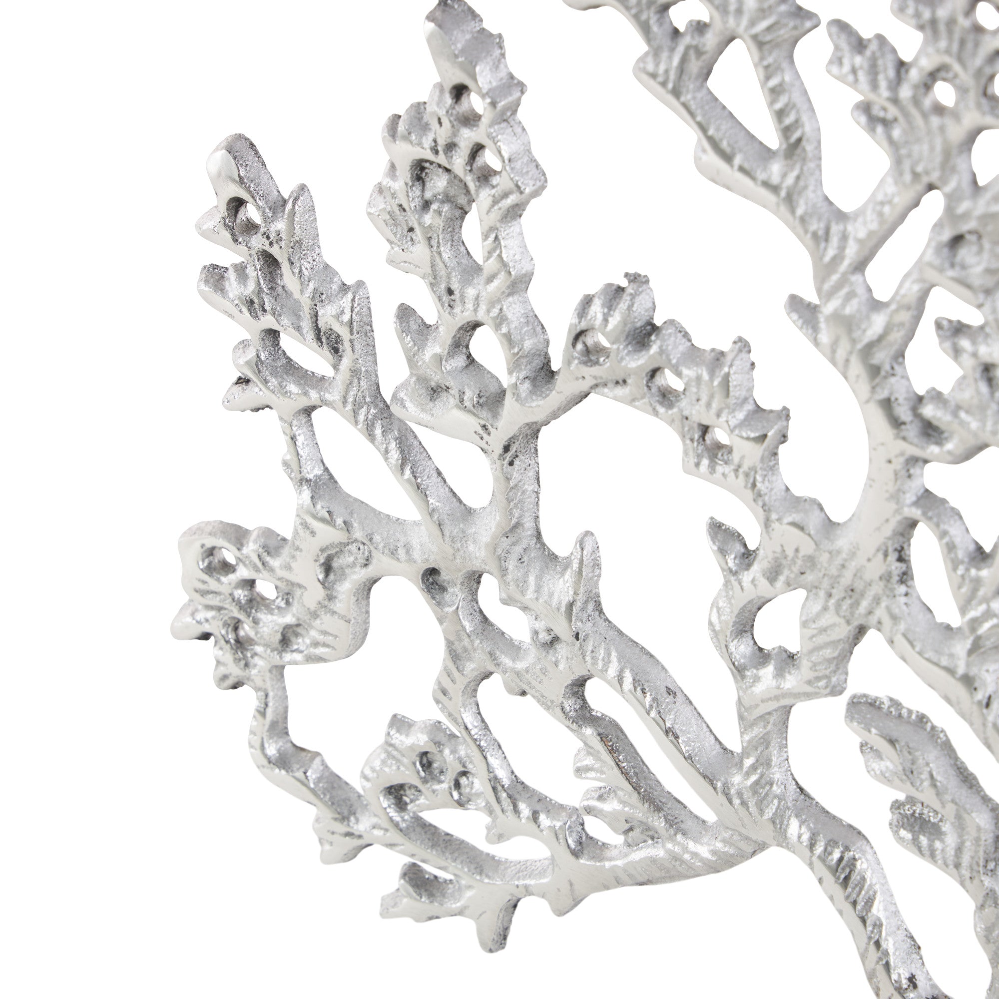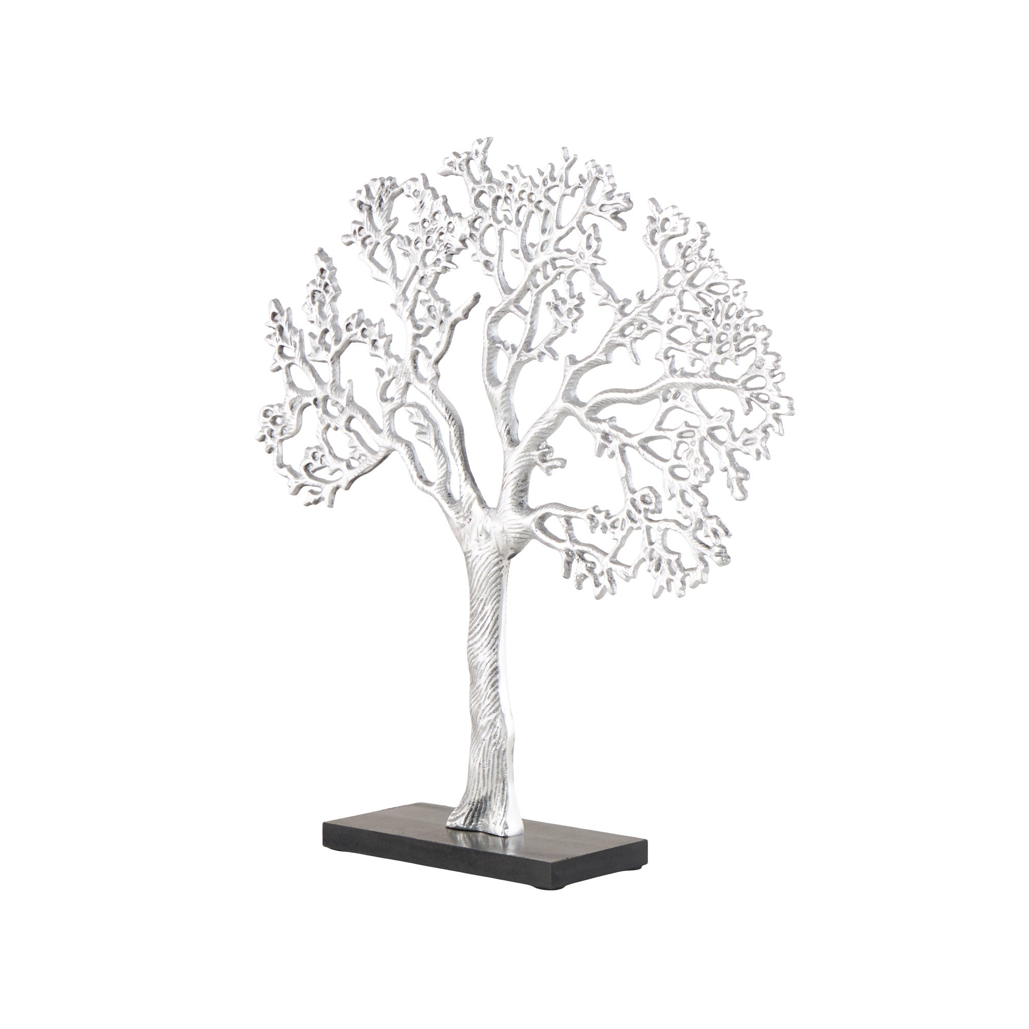 •The aluminum sculpture features a tree figure with a textured finish that catches the light beautifully
