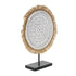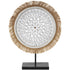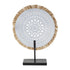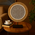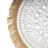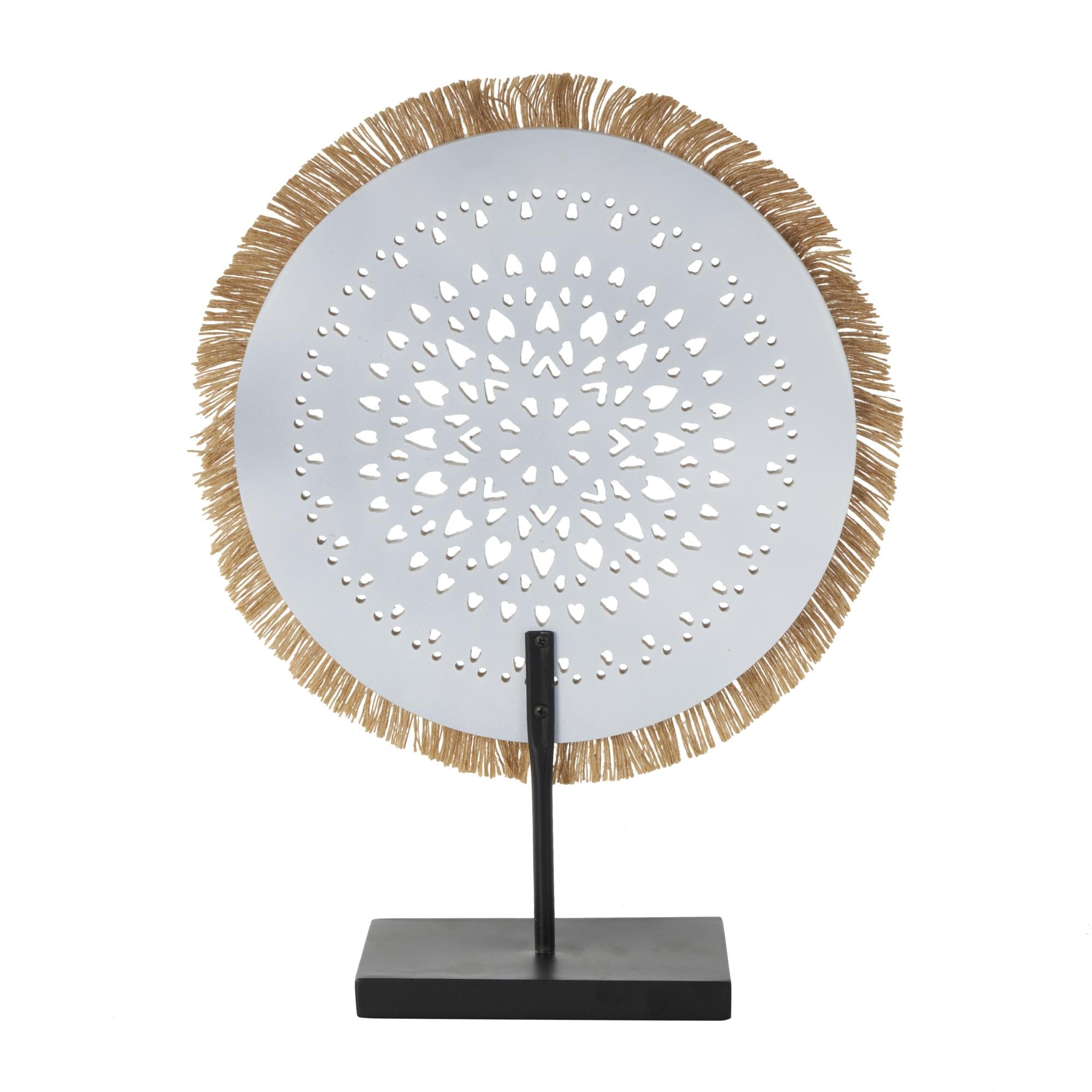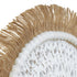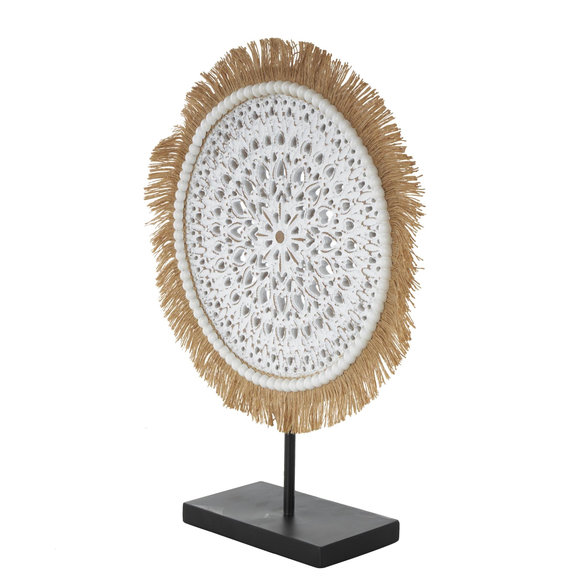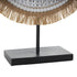•Round-shaped matte home decor figurine with tribal pattern and seagrass fringe sits atop a rectangular base