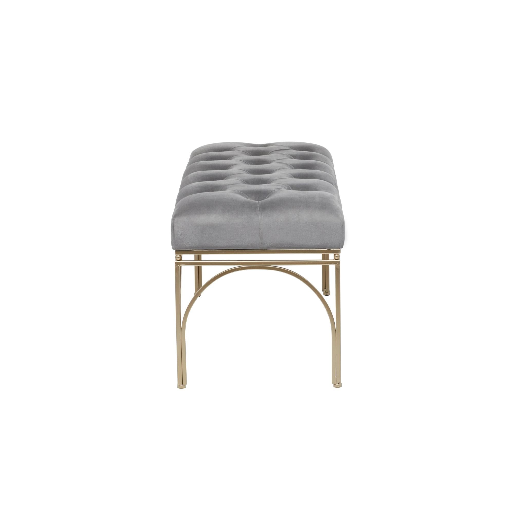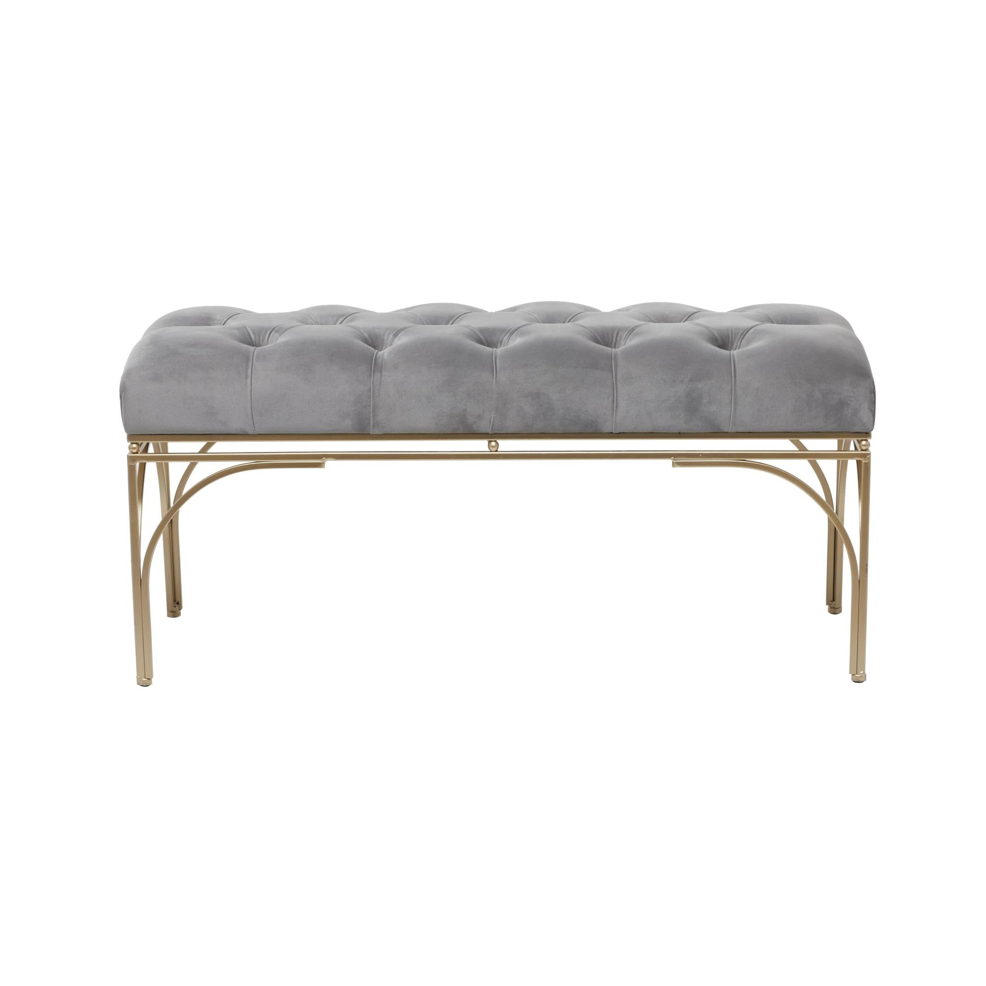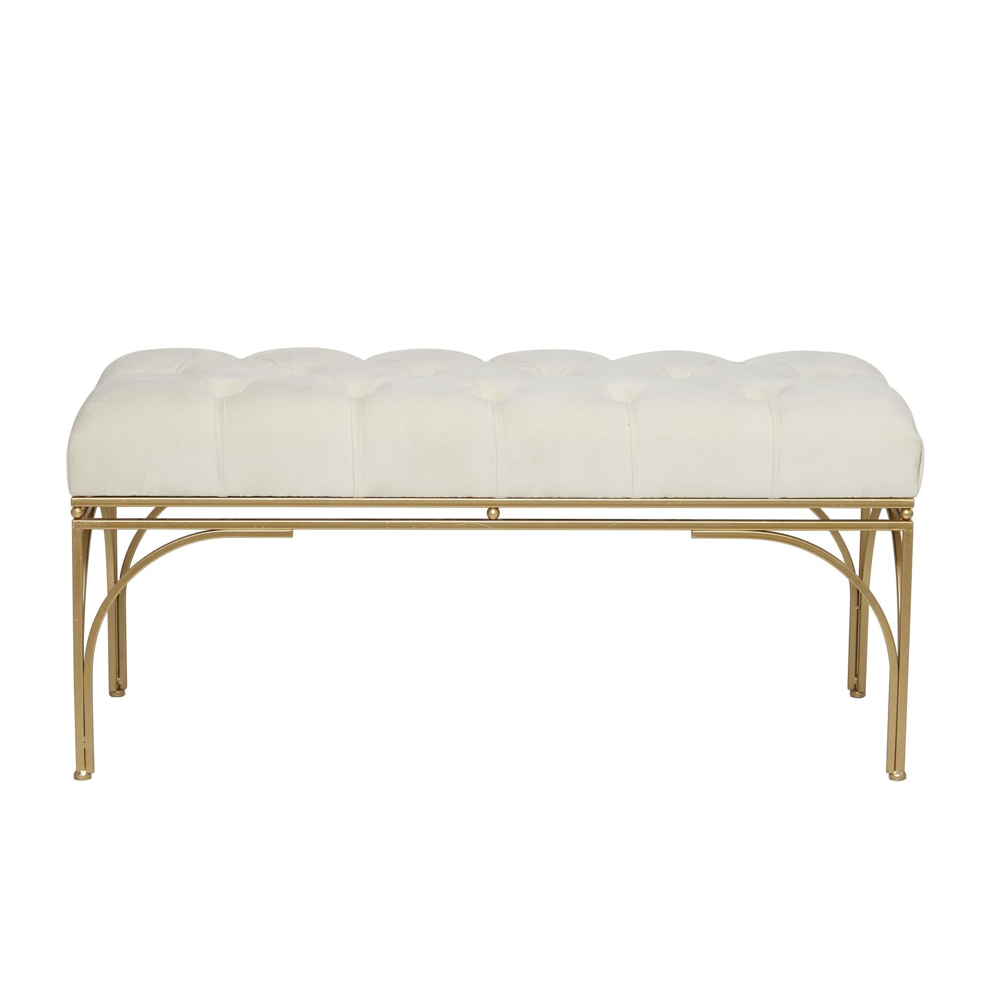 •This metal bench features a rectangular body structure with a button-cushioned velvet seat and four sturdy metal legs with a stunning arched bar design